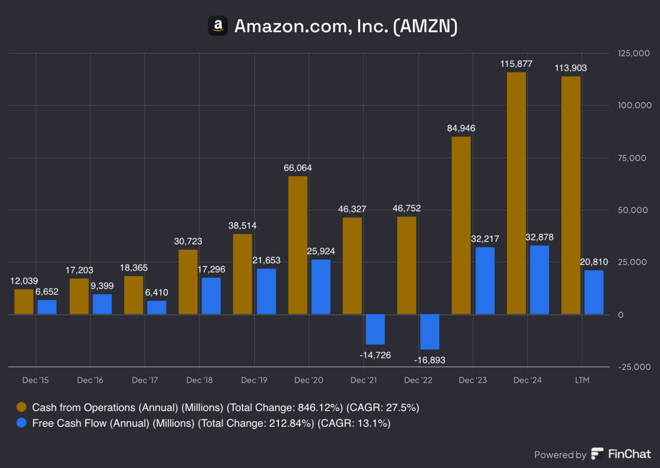 Free cash flow has materially improved since the 2022 lows as well, though it remains volatile given Amazonβs ongoing reinvestments. Thatβs why operating cash flow provides a clearer picture, and with figures now exceeding $100 billion, itβs clear that Amazon remains a powerful cash-generating business.