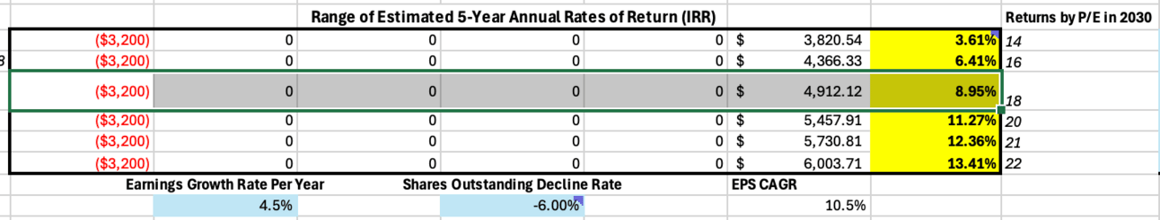 With a recent range between $3,200-3,400 per share, I think the scope of outcomes skews in favor of average returns going forward, as I just showed. I like to think through what would happen most of the time if I could simulate a thousand different realities with different growth rates, buyback rates, and P/Es by 2030. And as mentioned, my feeling is that, at current prices, due to the elevated P/E ratio, this range of possible outcomes tilts toward mediocre results.