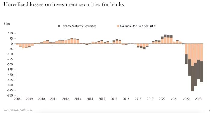 Without diving too into the weeds, one of the issues at hand structurally for banks is many had a) bought a lot of bonds in 2020 & 2021 and b) those bonds lost a lot of value on paper when, thanks to the Fed, interest rates began rising in 2022
