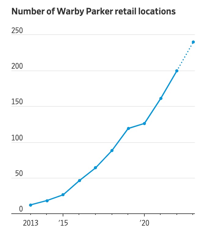 Today, Warby Parker does over $600 million in sales, mostly in its 200 locations, while providing a free pair of glasses to people in need with every purchase. The company closed some stores during the pandemic, but it has rebounded to compete in the massive glasses business ($140 billion industry), which includes prescription glasses, sunglasses, reading glasses, and Warby Parkerβs fast-growing contact lens business (70%-plus annual growth rate).