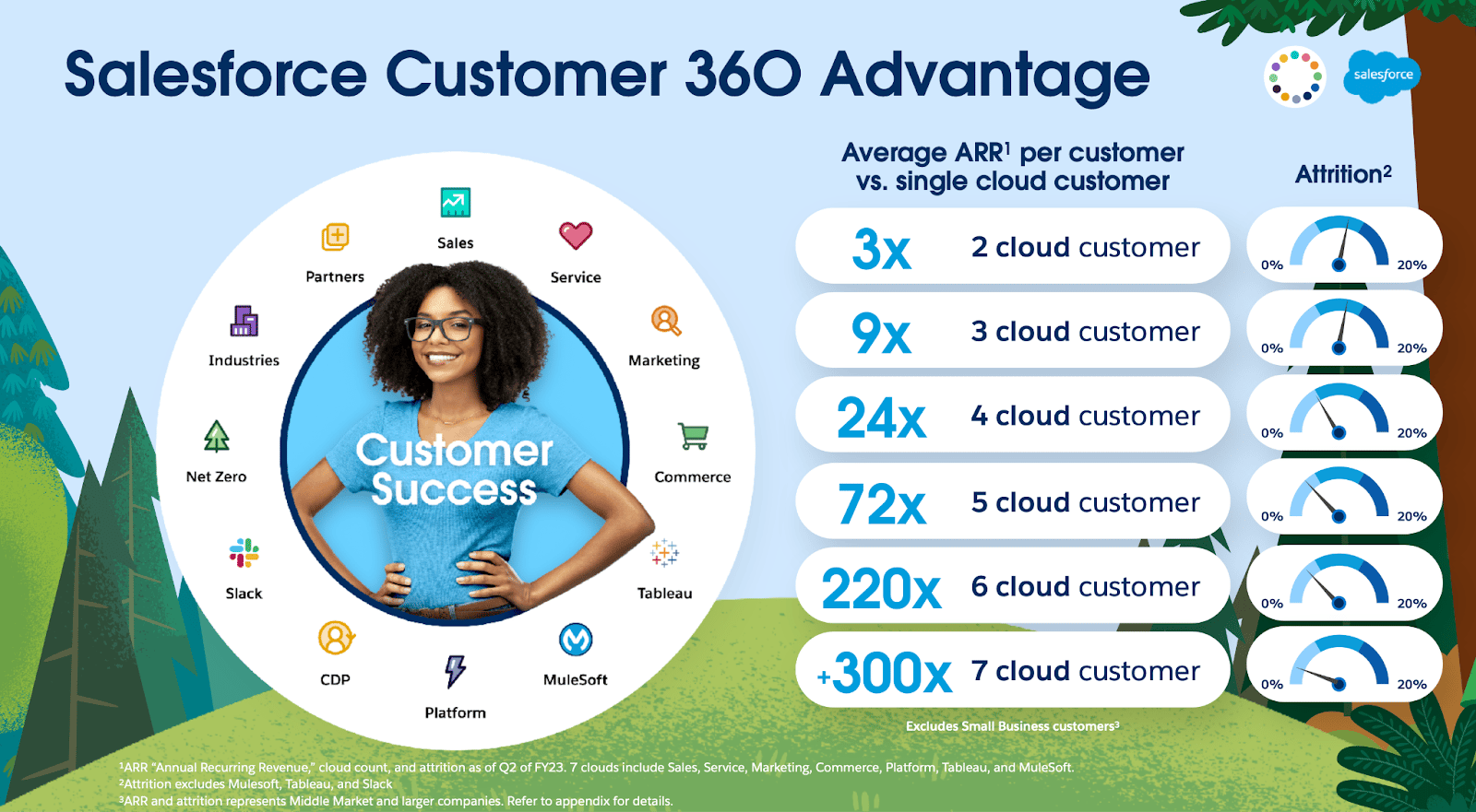 The retention data show just how sticky Salesforceâs products are. The company keeps about 92% of its customers, and the longer they stay, the more products they tend to use. That, in turn, drives higher revenue per client. A customer using two Salesforce Clouds generates roughly three times as much recurring revenue as one using only one Cloud.