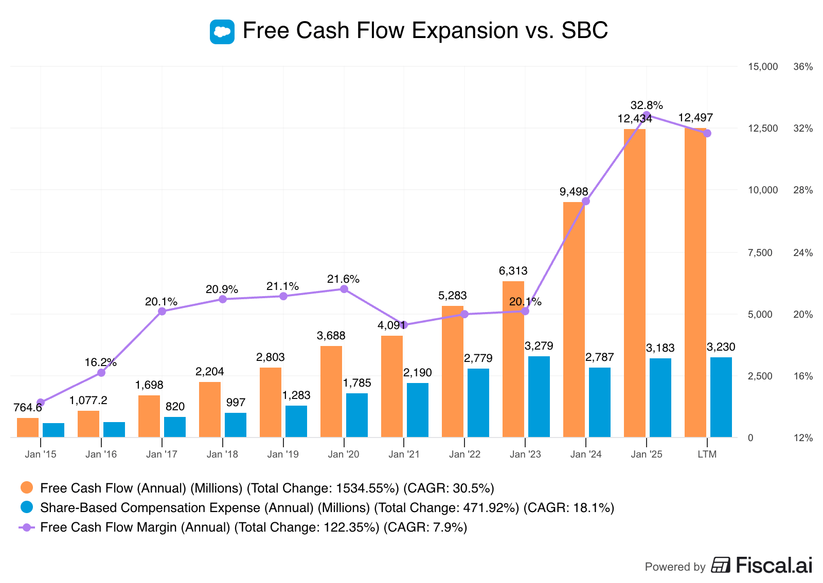 Adjusting for stock-based compensation, which remains substantial at around $3â$3.5 billion per year, free cash flow would fall closer to $9 billion. That implies an adjusted free cash flow yield of around 4%. The highest FCF yield Salesforce ever traded at.