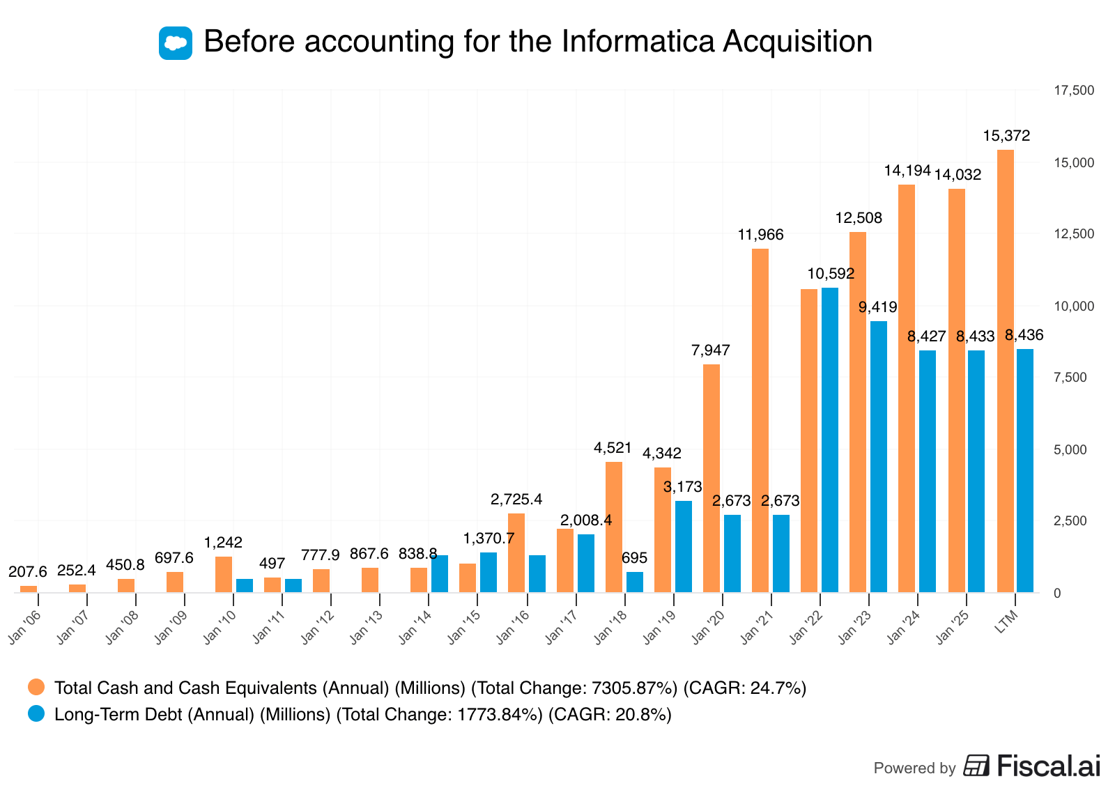 Given the uncertainty about future growth, it's reassuring that Salesforceâs balance sheet is more than solid. Even after accounting for the pending $8 billion Informatica acquisition, Salesforce will remain in a leverage-neutral position, with enough cash to pay off all long-term debt.