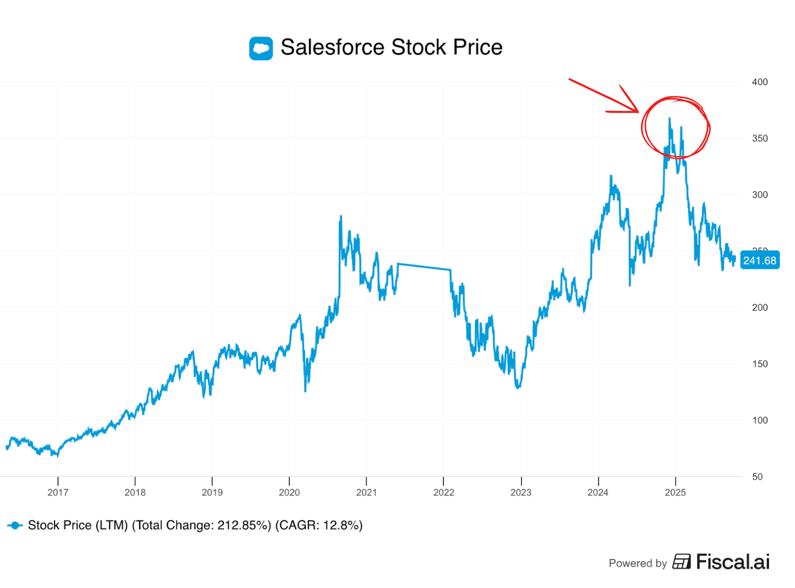 That pattern of large, expensive acquisitions has long frustrated Salesforce investors, which is why the market welcomed Benioffâs 2023 announcement that Salesforce would shift its focus away from M&A and prioritize organic growth, buybacks, and profitability. But that promise didnât last long. Earlier this year, Salesforce agreed to acquire Informatica for about $8 billion in cash. Letâs just say the timing and inconsistent messaging didnât exactly boost investor confidence.