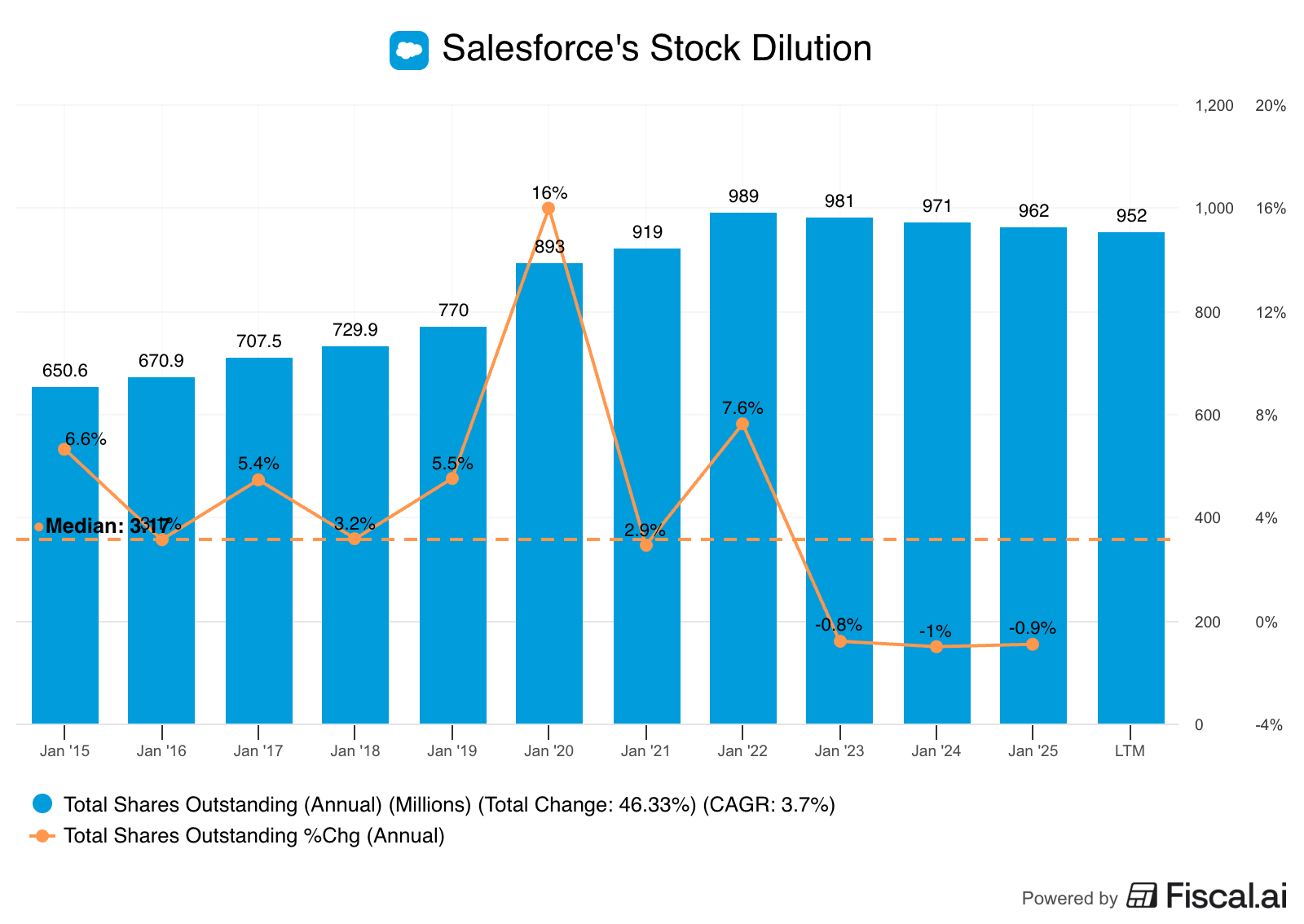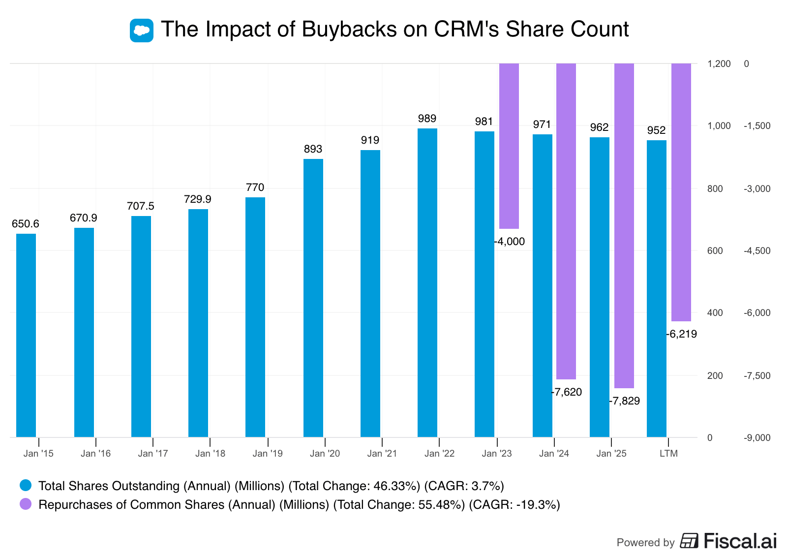 Share-based compensation remains another area of concern. Even with improved margins and record buybacks, stock grants still account for about 8% of revenue. Over the past two years, Salesforce has spent roughly $25 billion repurchasing shares, yet the total share count has fallen by only about 1% per year. The buybacks have largely just offset dilution rather than meaningfully reducing it.