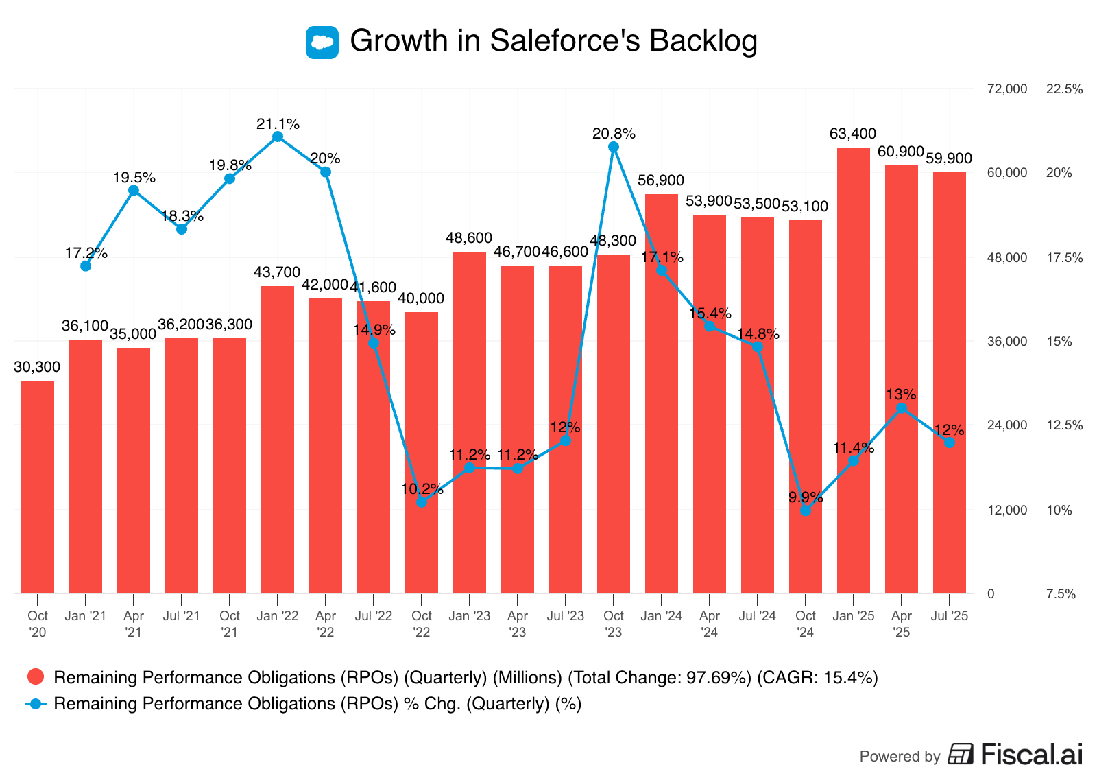 The best-case scenario for Salesforce would be a reacceleration of the top line while maintaining cash flow discipline. The best indicators of Salesforceâs long-term demand are its Remaining Performance Obligations (RPOs) â the total value of contracted revenue not yet recognized â and the subset due within 12 months, known as cRPOs.