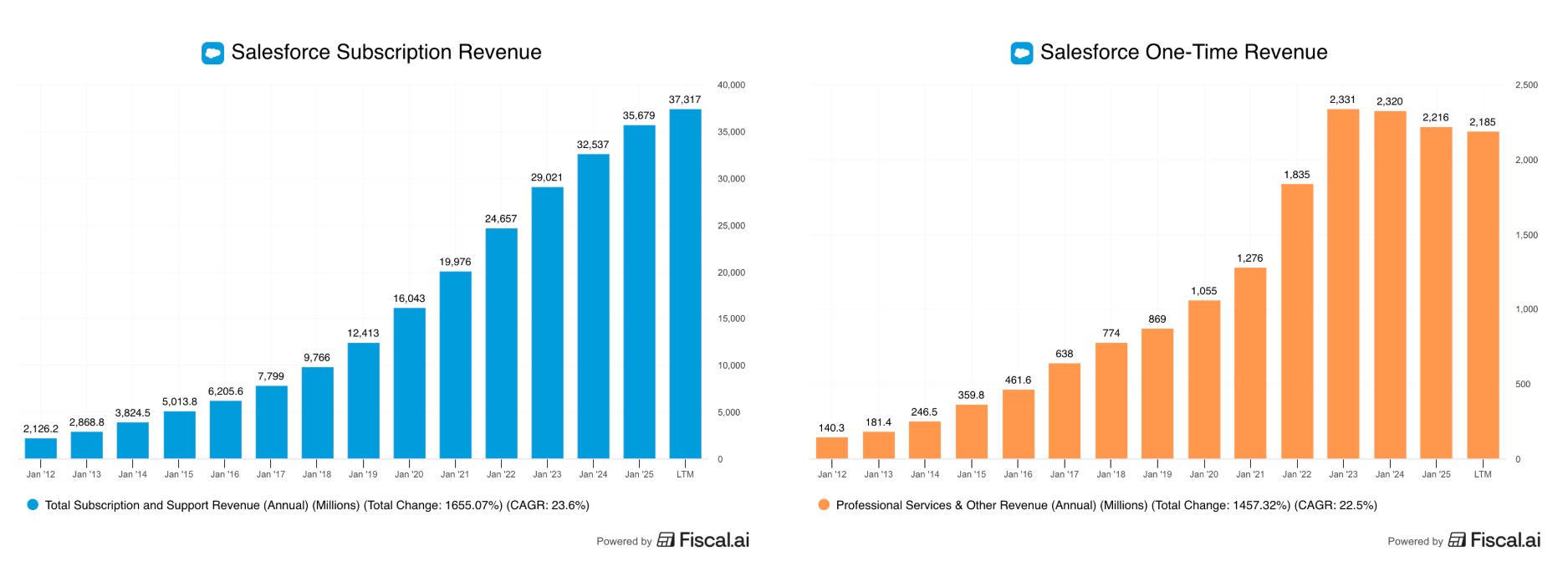 The remaining 5% of Salesforceâs revenue comes from one-time services, such as consulting, implementation support, and product customization. This part of the business is relatively small and not particularly profitable. In fact, it operates at a slight loss, but it serves an important strategic purpose.