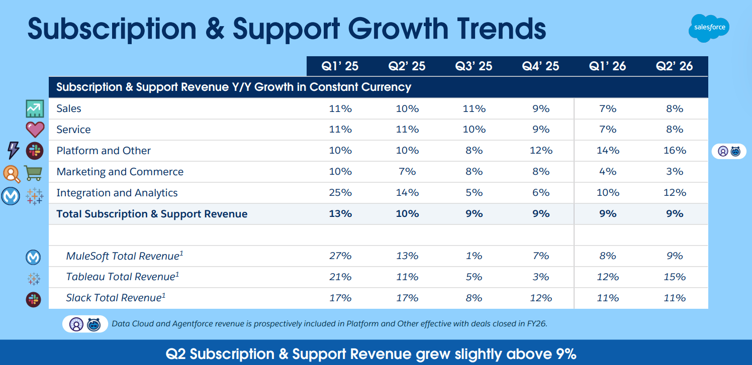 But the Agentforce story is a mixed bag. Within a year of launch, the company reported more than 12,500 Agentforce deals, although only about half of those customers are paying, and 120% year-over-year growth in its Data Cloud and AI-related revenue. Still, these numbers tell only part of the story. The Agentforce segment accounts for roughly 10% of total revenue, meaning it is not yet large enough to move the needle for a $250 billion company.