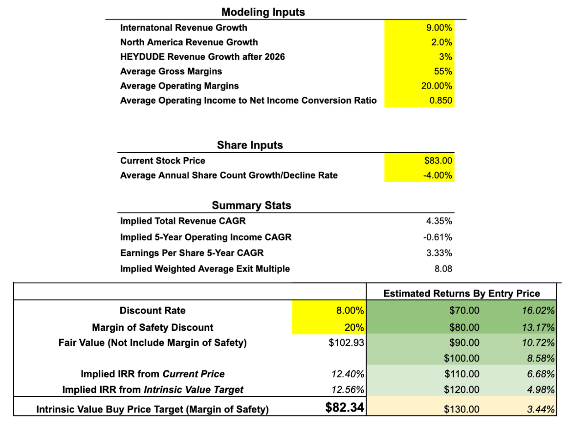So itβs interesting that my updated assumptions still landed exactly where the current price is. I revised operating margins by 4% and revenue growth by 1%, due to slower growth in the Crocs, but especially in the HEYDUDE brand.