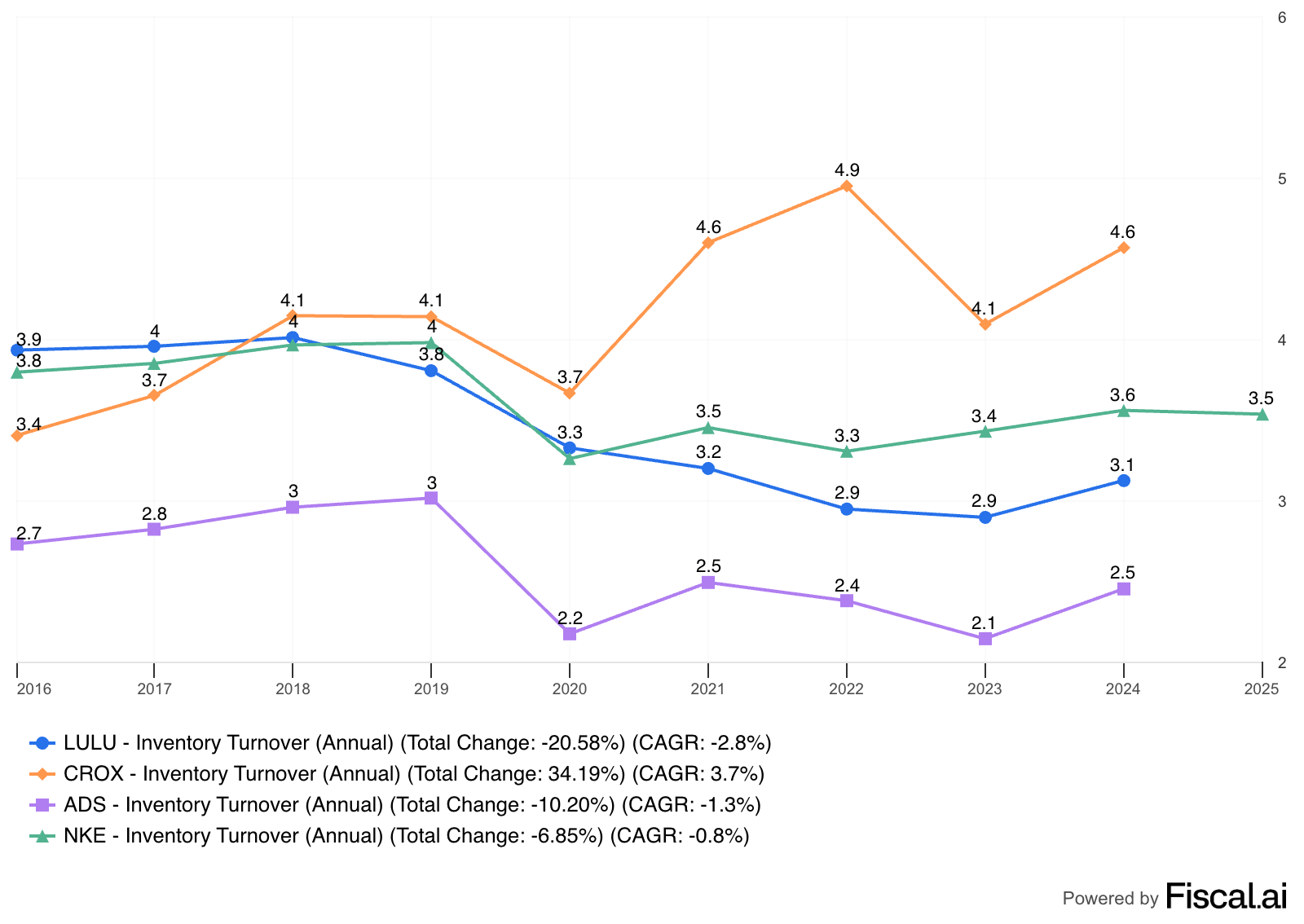 The good news is that Crocsβ management is hyperaware of that, and Crocsβ inventory turnover is once again ahead of the competition. They currently turn inventory about four and a half times a year. Well ahead of Adidas, Lululemon, and Nike.