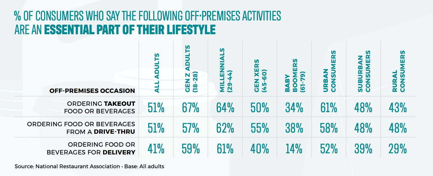 Shown below, 59% of Gen Z claim that ordering food/beverages for delivery is an essential part of their lifestyle (and 61% for Millennials!), versus 40% for Gen Xers and just 14% for Baby Boomers.
