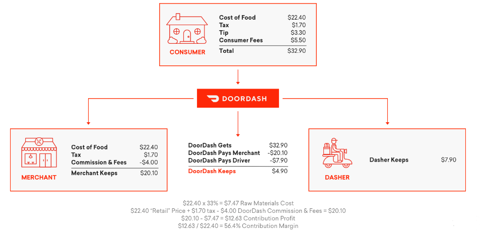 The restaurant gets paid for the cost of the food minus the 15-30% commission to DoorDash; the Dasher gets their payout (about $7.90 in this example), and DoorDash keeps the remainder, which ends up being around $4.90 on that ~$33 purchase.