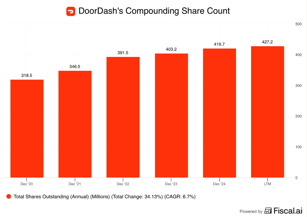 This is all napkin math to say that, with what I think are plausible but still optimistic assumptions, the expected returns donβt look good for shares in DASH at current prices, barring growth that dramatically exceeds Wall Streetβs expectations, without saying anything about how ongoing dilution would further chip away at expected returns.