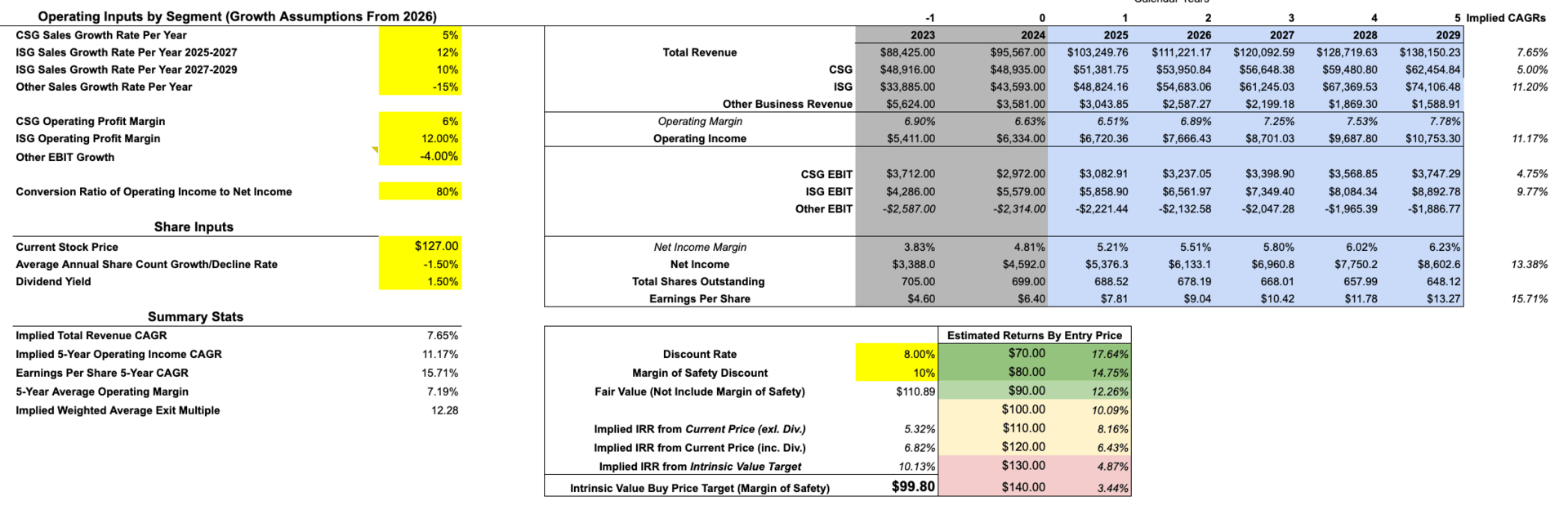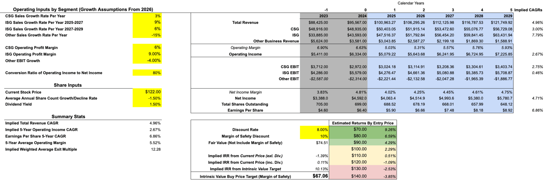 When I add a bit more pessimism and adjust just three assumptions, Dellβs fair value drops to about $70. The changes: CSG grows at 3% instead of 5% (in line with historical averages), ISG grows at 8% instead of 11%, and, most importantly, ISG operating margins come in at 9% rather than 12%.
