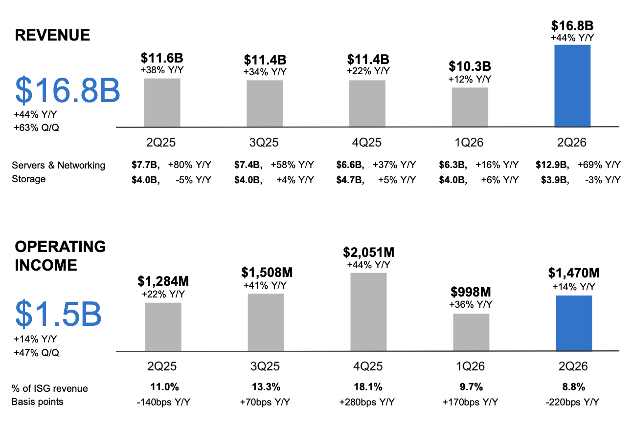 But the latest earnings release showed how the mix shift is playing out: rapid AI growth, combined with thinner margins, is squeezing profitability. ISG margins fell from 11% in Q2 FY25 to just 8.8% in Q2 FY26 (Dellβs fiscal year runs a year ahead).