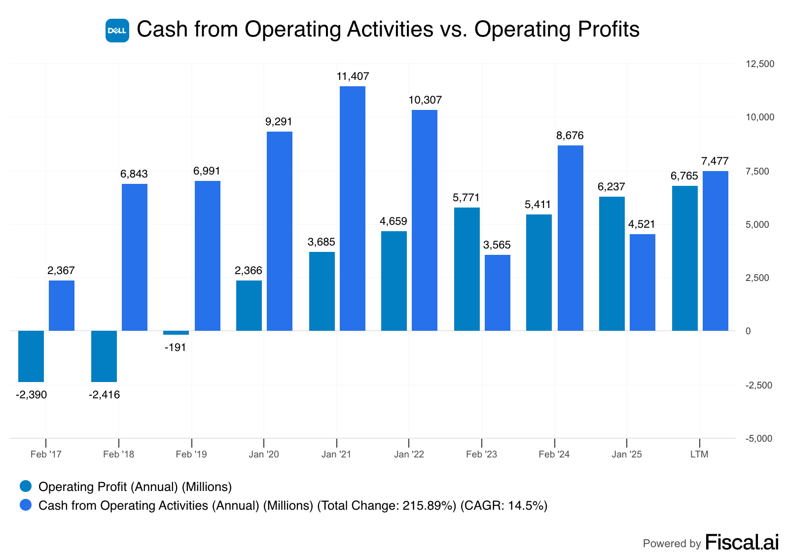 Speaking of profits, letβs talk about how Dell puts them to work. One of the first things that stands out in its financials is the volatility of operating cash flow. In some years, it tops $10 billion, while in others it falls to just $3β4 billion. At first glance, that might suggest an unstable business, but most of the swings are explained by working capital, changes in supplier payments, inventories, and customer prepayments.