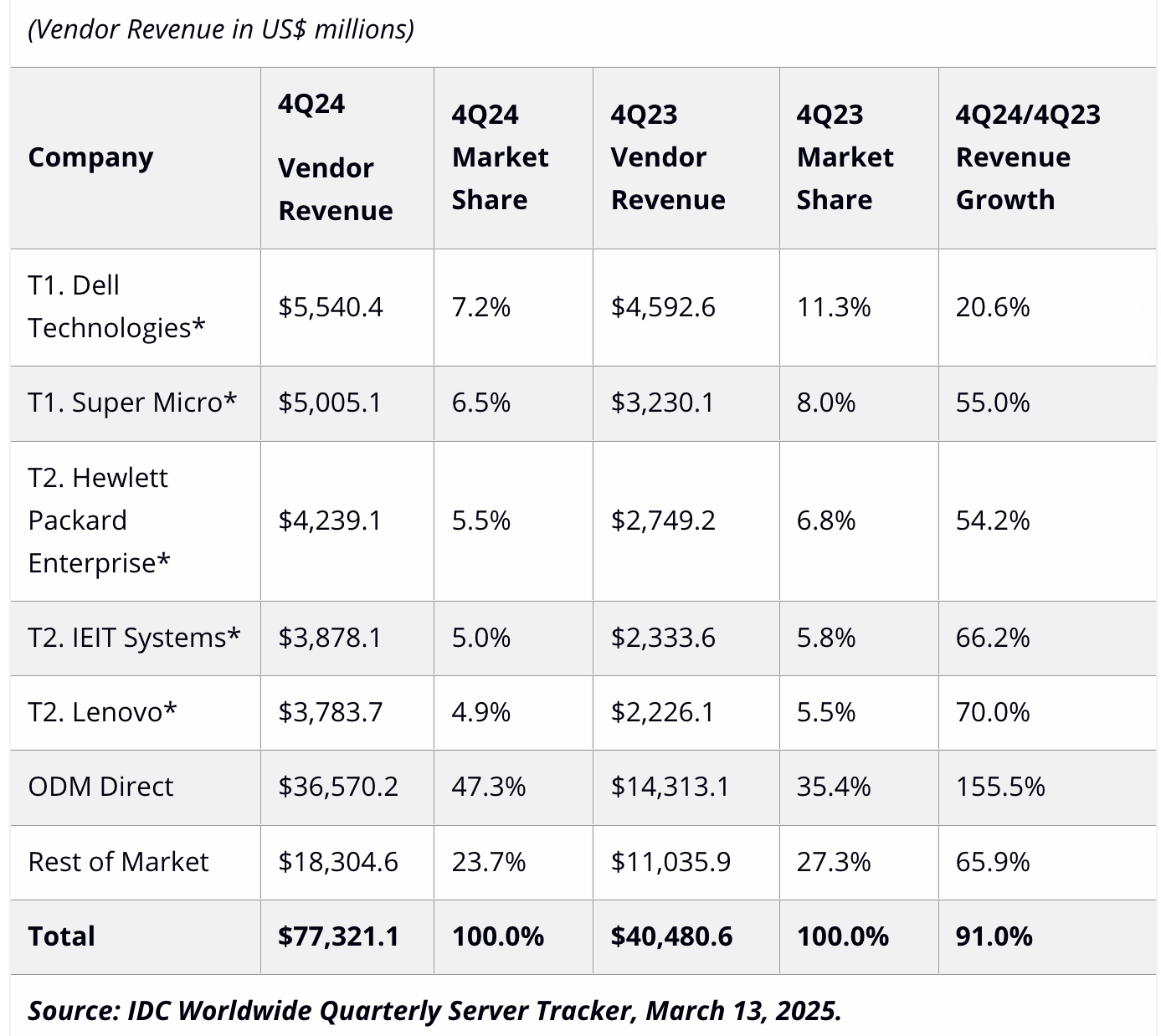 And then thereβs Supermicro, the stock market darling of the first half of the year. Supermicroβs appeal is that thereβs no legacy business. It can design and ship new server configurations extremely quickly. However, it lacks the global services and enterprise sales footprint of Dell, making it more challenging to secure and support multi-billion-dollar infrastructure deals.