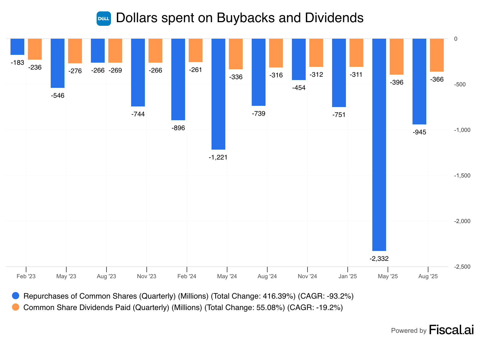 Buybacks have become a major part of shareholder returns as well. Once leverage was under control, Dell began repurchasing shares aggressively. In just the first quarter of FY2026, Dell bought back a record-breaking $2.3 billion worth of shares. And the board has already authorized more than $12 billion in future buybacks.