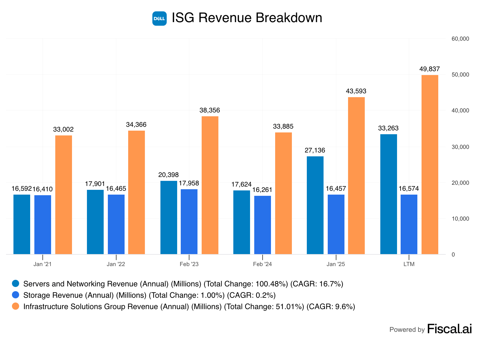 That acquisition opened up an entirely new field for Dell: high-performance storage, data protection, and the above-mentioned stake in VMware. Today, that βend-to-endβ offering of servers, storage, networking, and services remains the foundation of Dellβs Infrastructure Solutions Group (ISG), the part of the business now driving growth through AI.