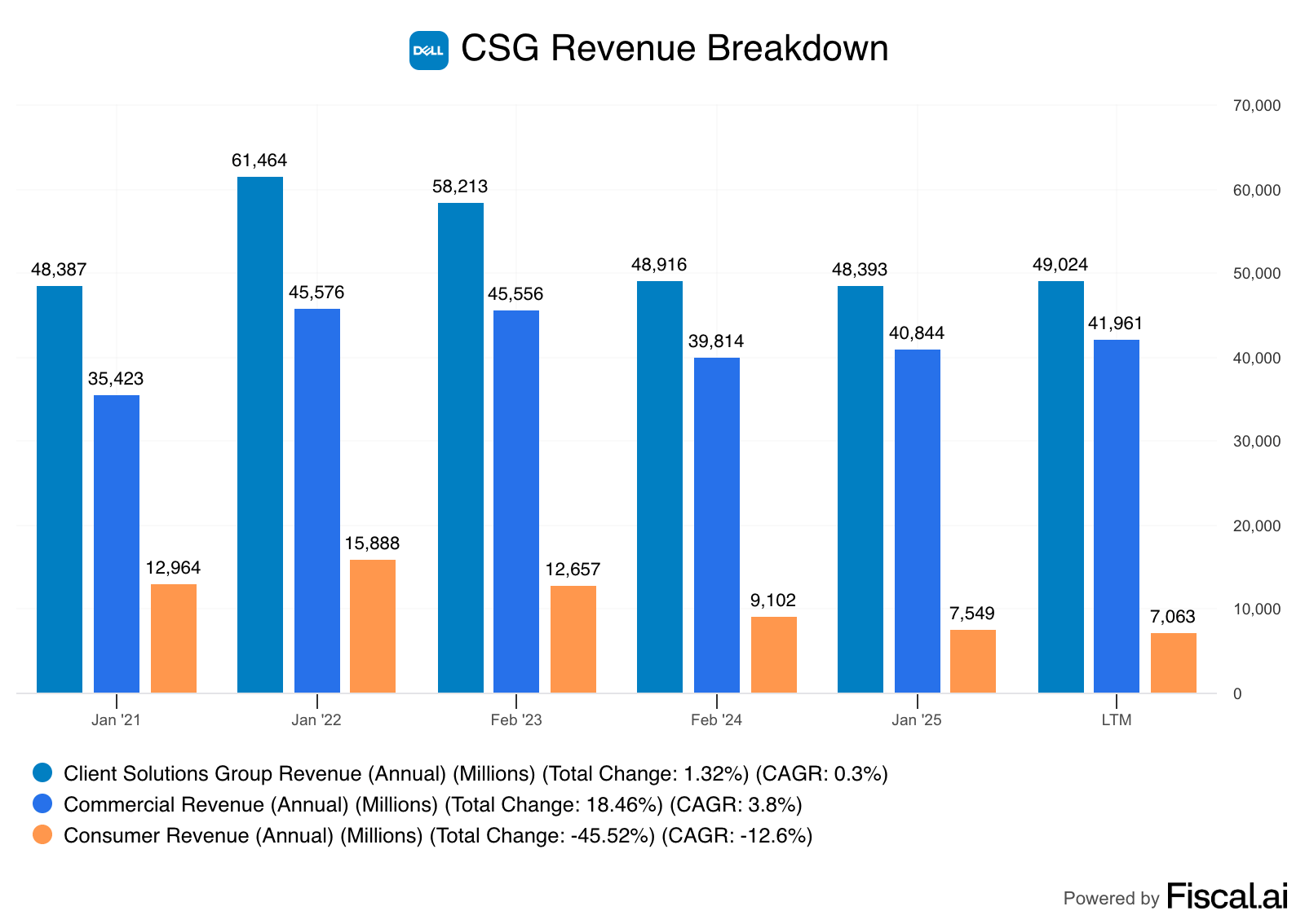 The PC market is notoriously cyclical. Sales surged in 2020 and 2021 during the remote-work boom, then slumped in 2022 and 2023 as demand cooled. Dellβs results reflect that pattern: CSG revenue fell 16% in FY24 to about $49 billion, with consumer sales down nearly 30%. By late FY25, though, things had stabilized. Commercial demand began to recover, allowing Dell to keep revenue roughly flat year over year.