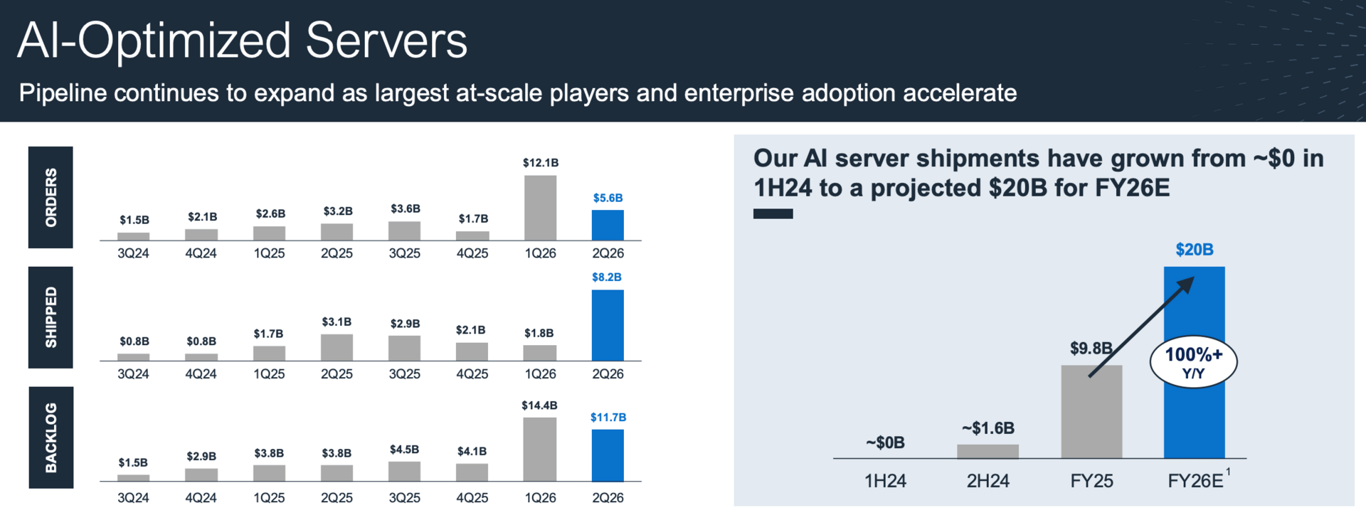 In FY25, Dell shipped about $10 billion worth of AI servers and ended the year with a backlog of over $14 billion waiting to be delivered. In just the first half of this year, shipments already topped $10 billion, and the backlog still stands at over $11 billion.