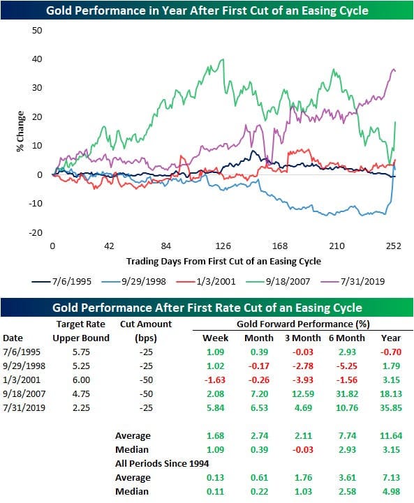 βAfter an interest rate cut, there has only been one time, 1998, when gold trended significantly lower after a rate cut throughout the next year,βBespoke Investment Group found. βEven then, close to the one-year mark, it surged as the Dot Com crash started.β