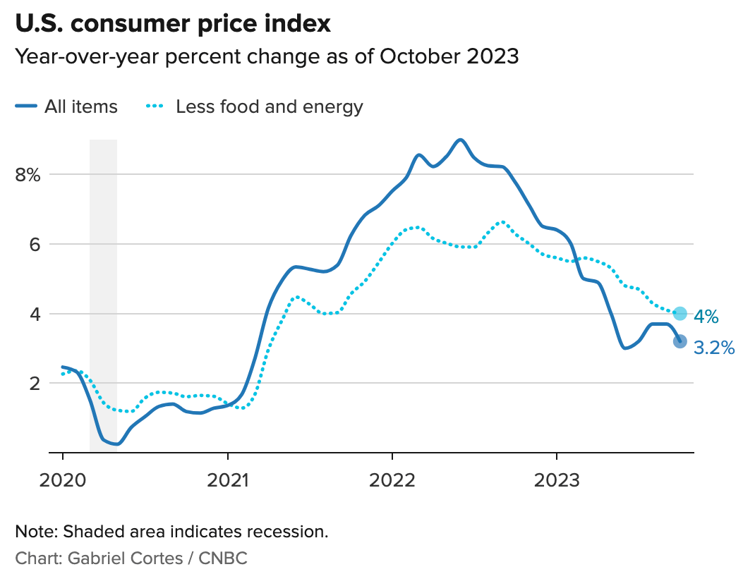 As of October, the Consumer Price Index has risen just 3.2% since last year. Though weβre not at the Fedβs goal of 2 percent, the report provides more evidence for Fed officials that their strategy has things moving in the right direction.