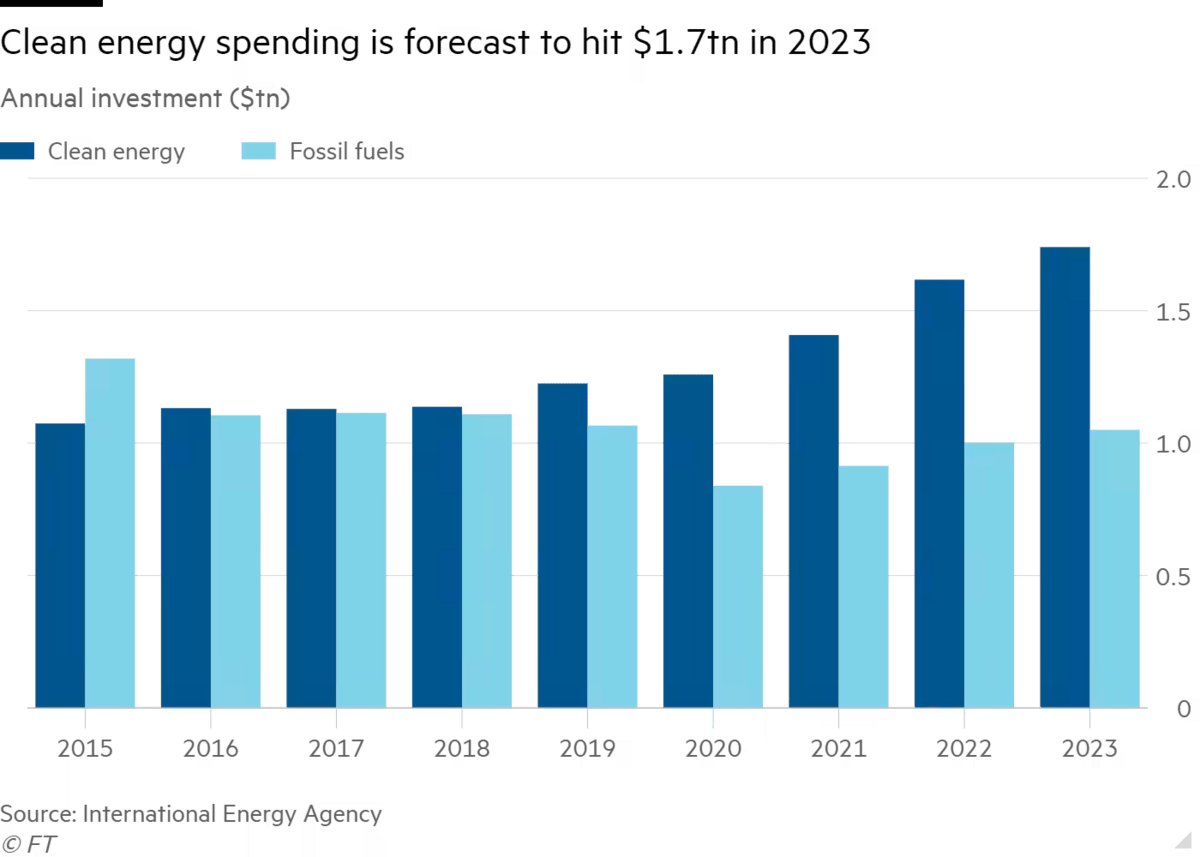In 2023, $1.7 trillion will be spent on clean tech vs. $1 trillion on fossil fuels. In 2018, the roughly $2 trillion in annual energy investment was split between fossil fuels and clean tech.