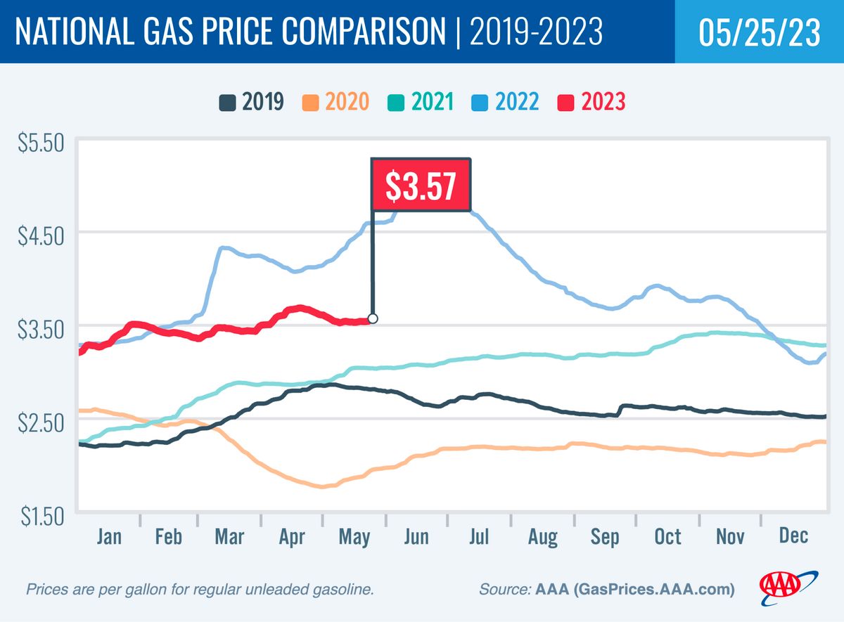 The national average price for regular gasoline is a full dollar a gallon lower than a year ago. Drivers paid over $4.60 in May 2022, and prices had reached $5 by the second week of June when inflation peaked. This week, they paid about $3.50 a gallon for regular gasoline, according to AAA.