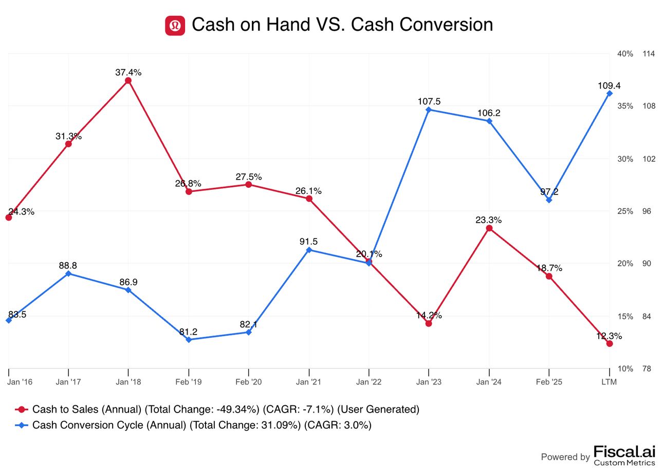 Still, less cash on hand means reduced shock absorbers if consumer demand softens or tariffs pinch margins, and suggests that the business could be holding onto inventory for longer (not good), leading us to the next data point: Luluās widening cash-conversion cycle.