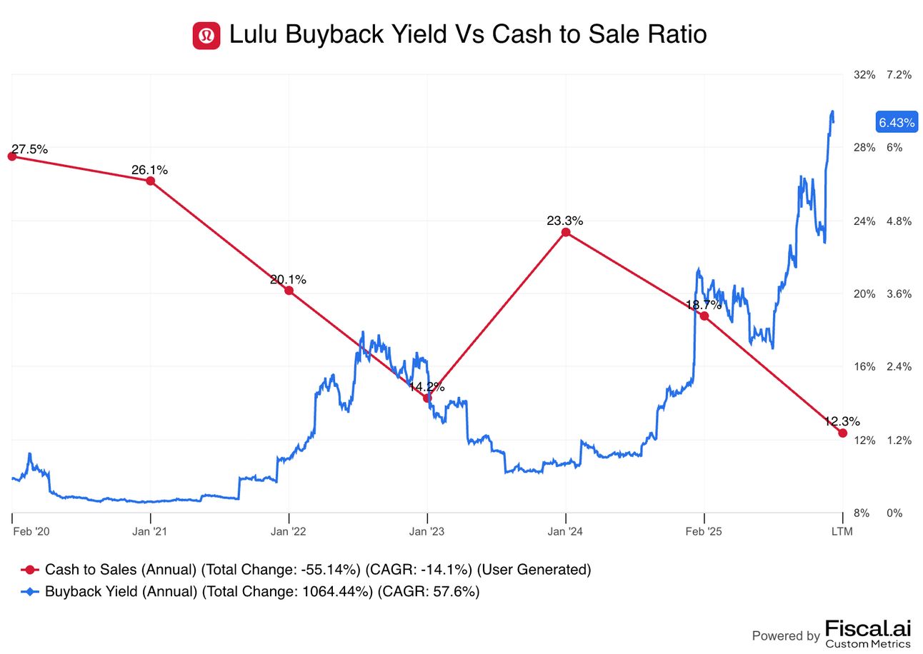 Still, itās not shocking that A) cash-to-sales has declined (in part from buybacks), B) inventory is sticking on the balance sheet longer (mainly due to offering more types of products beyond their original items) and C) Lulu is more aggressive about stocking up on inventory after war in Europe, tariffs, and a global pandemic have flipped supply chains upside down in the last 5 years.
