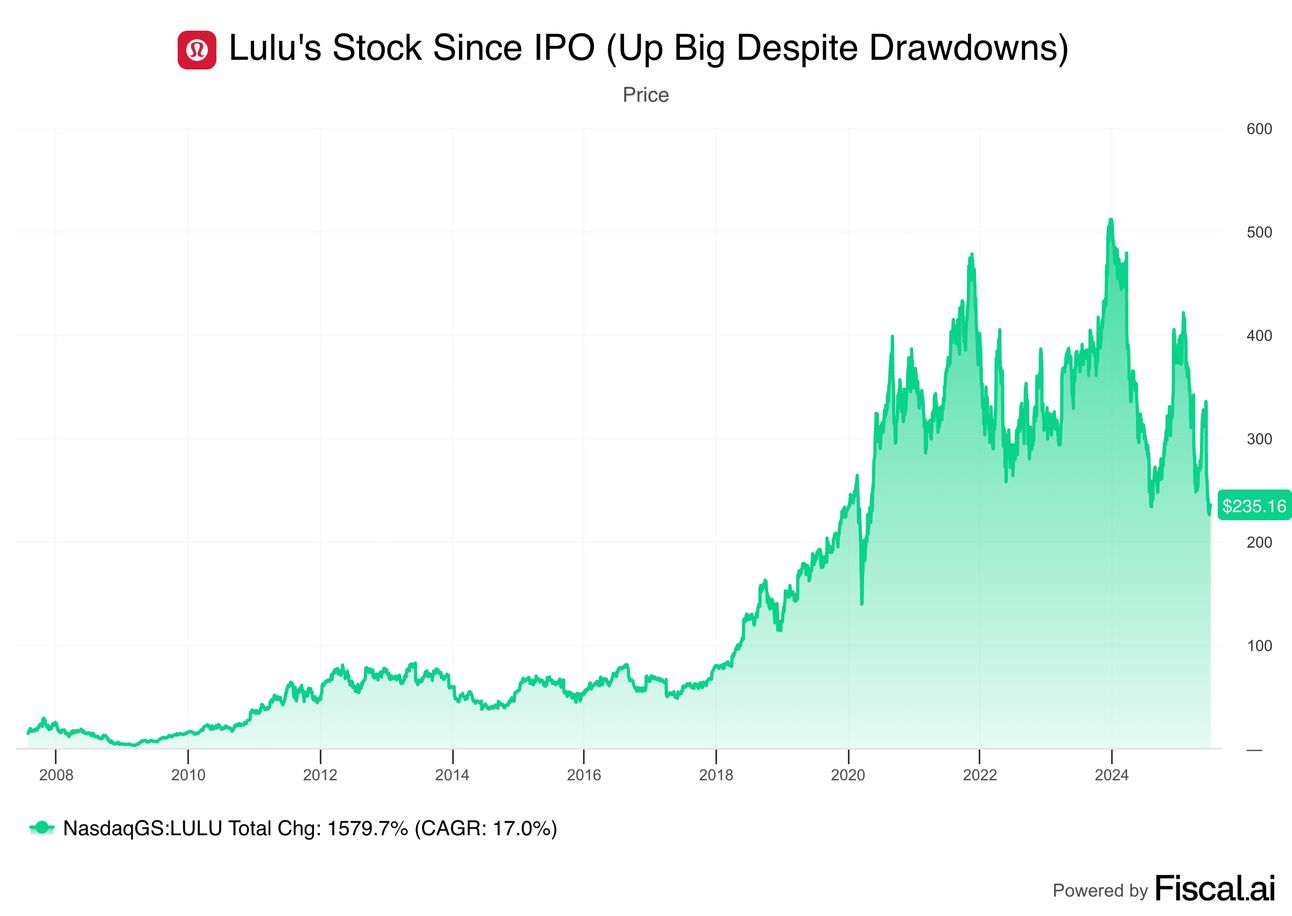 Luluās brand truly resonates, and its products are legitimately higher quality than peers, so while I would never argue that the brand couldnāt go stale in North America and see sales flatlines, I also have trouble imagining Luluās financials getting entirely wiped out, which is why I see the worst-case scenario as really only being about 15-20% lower after the stock has already fallen 50% YTD (for plausible worst-case scenarios over 5 years, that aināt so bad, but is clearly subjective ā things can always be worse than I expected).
