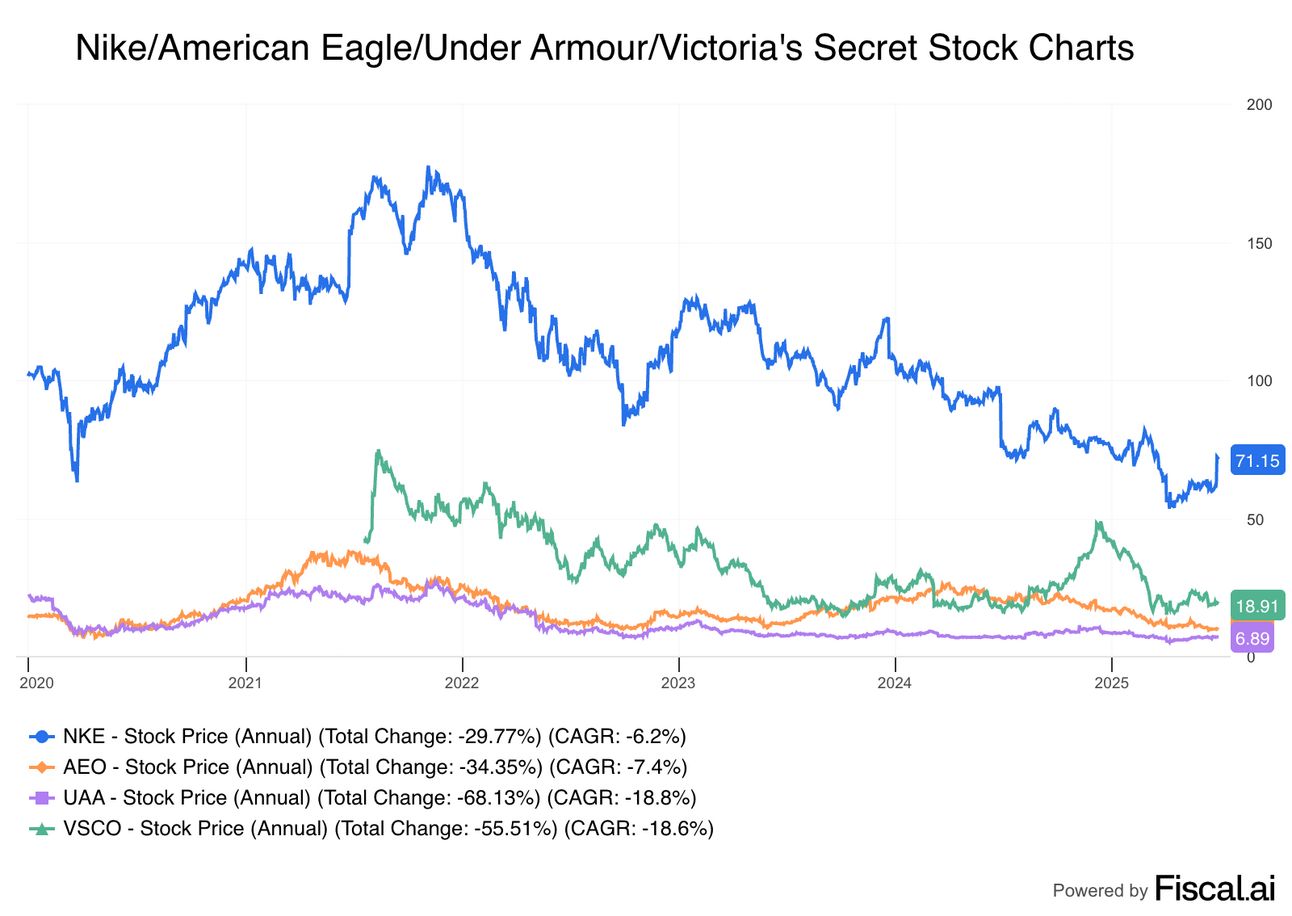 Look no further than Under Armour, American Eagle, Victoriaās Secret, and even Nike, to a lesser extent, in recent years. All promised that, perhaps, āthis time is different,ā only for the brands to fall into an inevitable downcycle, or worse. See their returns over the last 5 years for yourself: