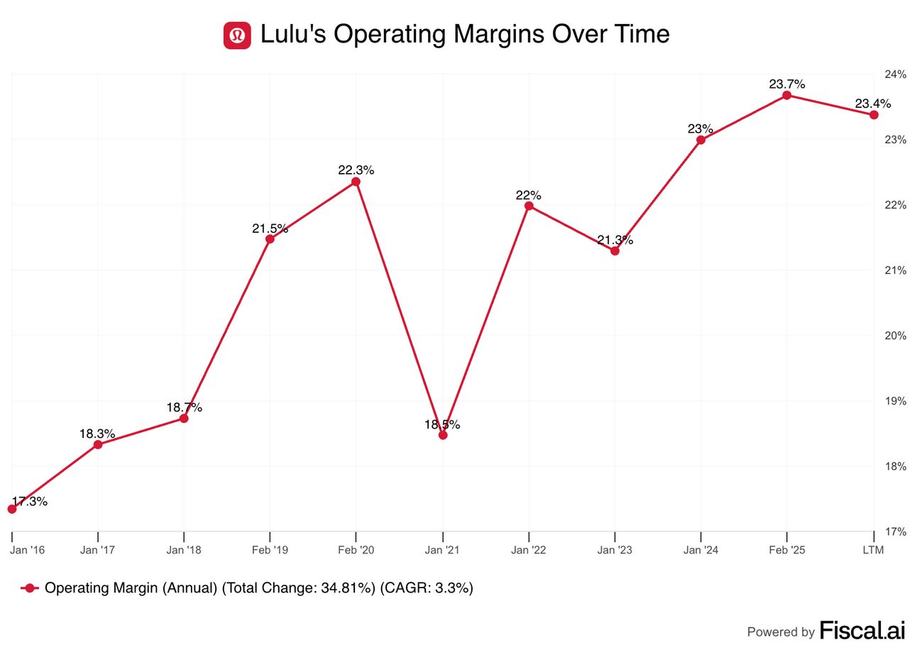 A best-in-class gross margin has persisted in the high-fifties, and operating margins remain about double Nikeās and have been steadily rising, as the company has repeatedly doubled its sales overall (growing its menswear and international sales even faster).