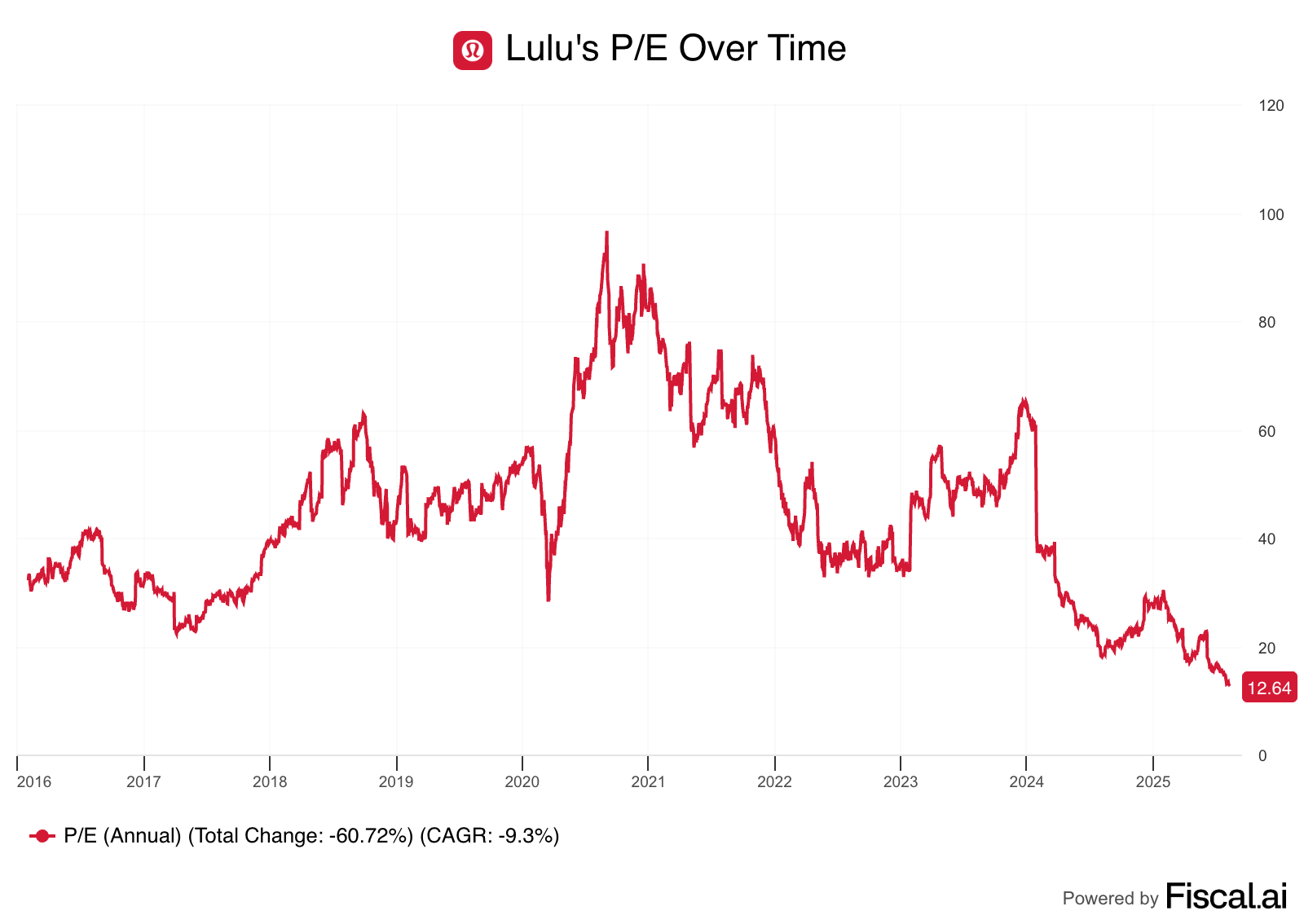 The bull thesis starts with the observation that Luluās present valuation already bakes in a large slice of disappointment. The shares have been dramatically re-rated, as the stock has fallen over 63% since its peak.