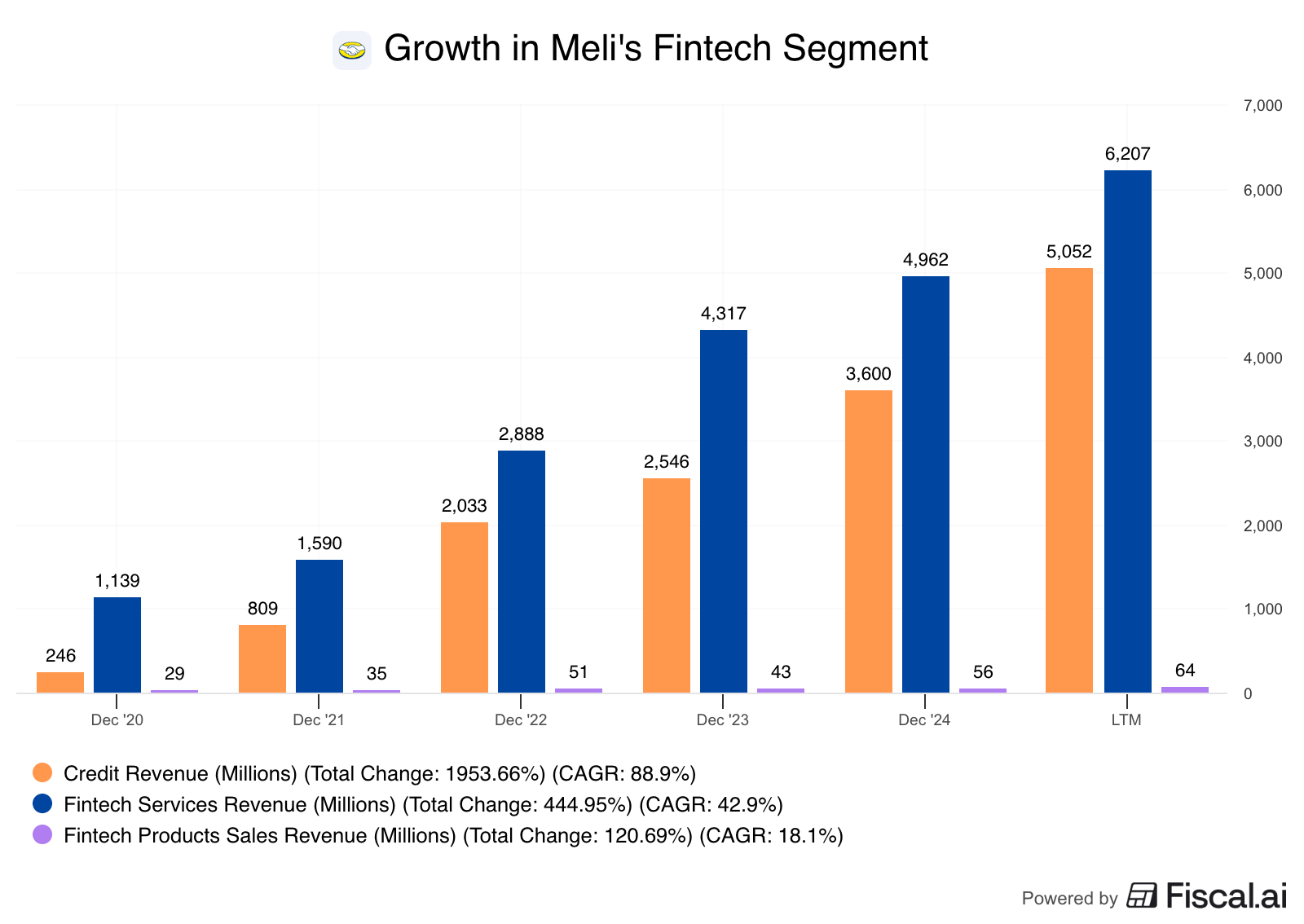 Second would be credit. Mercado Pago offers credit cards, consumer loans, and working-capital advances to merchants. This has become the fastest-growing part of the fintech business by far, with the credit portfolio compounding at extremely high rates over the last several years.