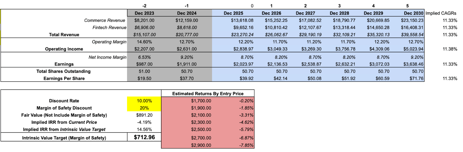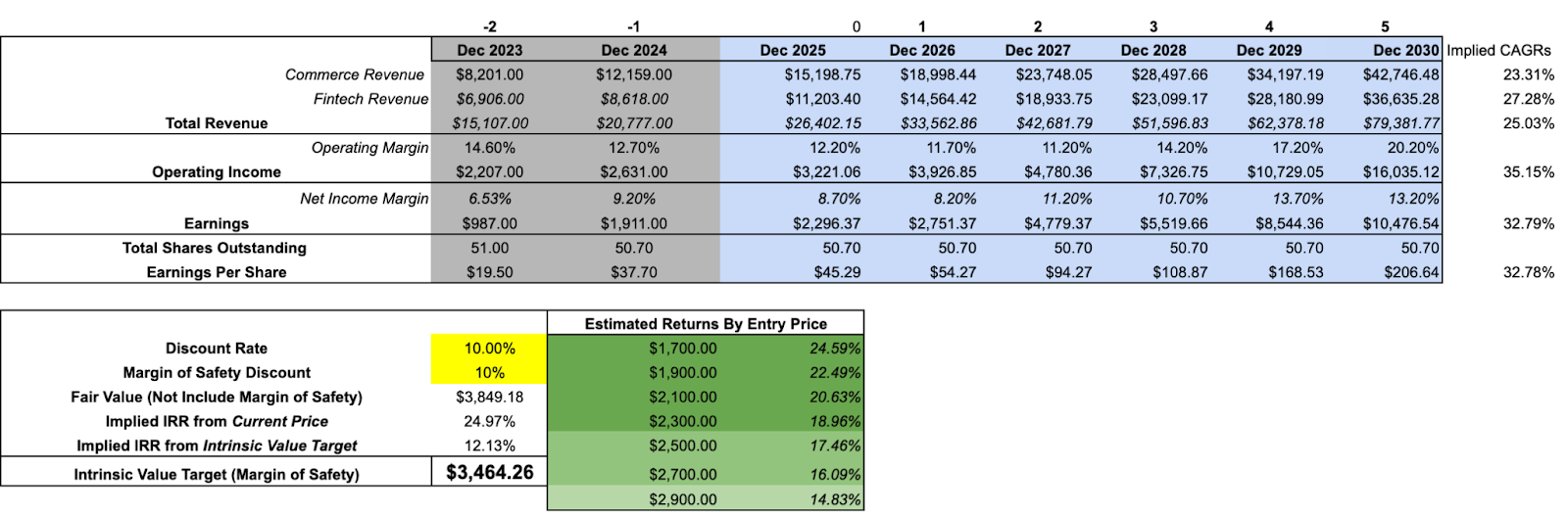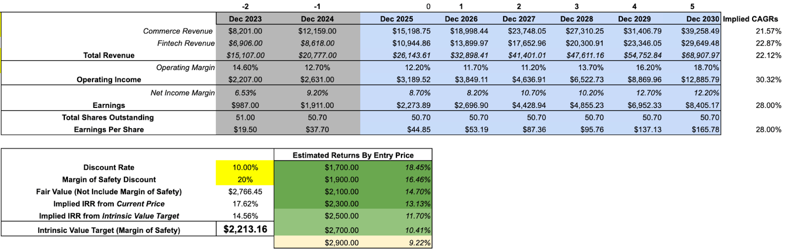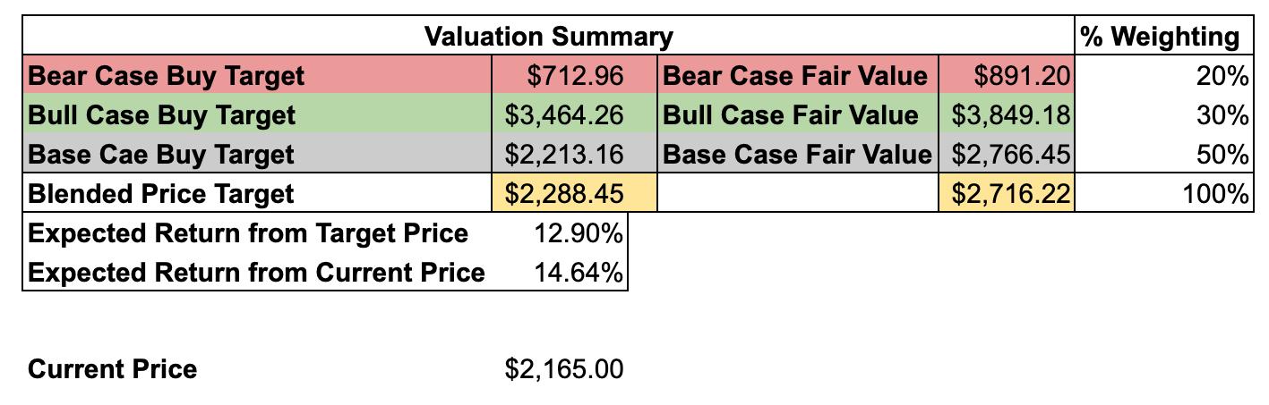 Using these assumptions, keeping the share count unchanged, applying a 26x multiple and a 10% discount rate, deliberately higher than the usual 8% to account we use, for geographic and macro risk, the resulting fair value comes out around $2,700 to $2,800 per share. Applying an additional 20% margin of safety brings that down to roughly $2,200.