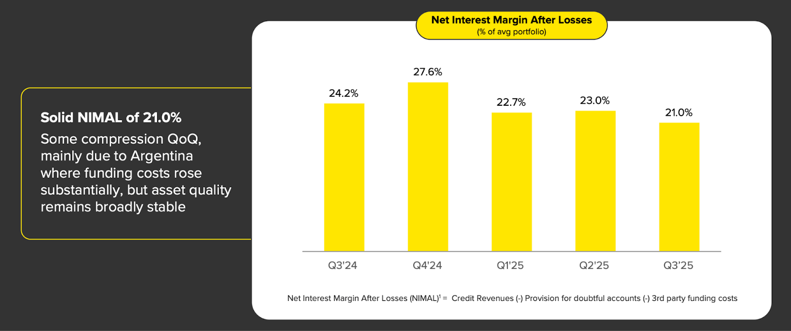 So, in other words, Mercado Pago takes on more risk, but it also gets paid significantly more for doing so. And importantly, both of them carry more reserves (provision coverage) than needed to cover all expected losses.