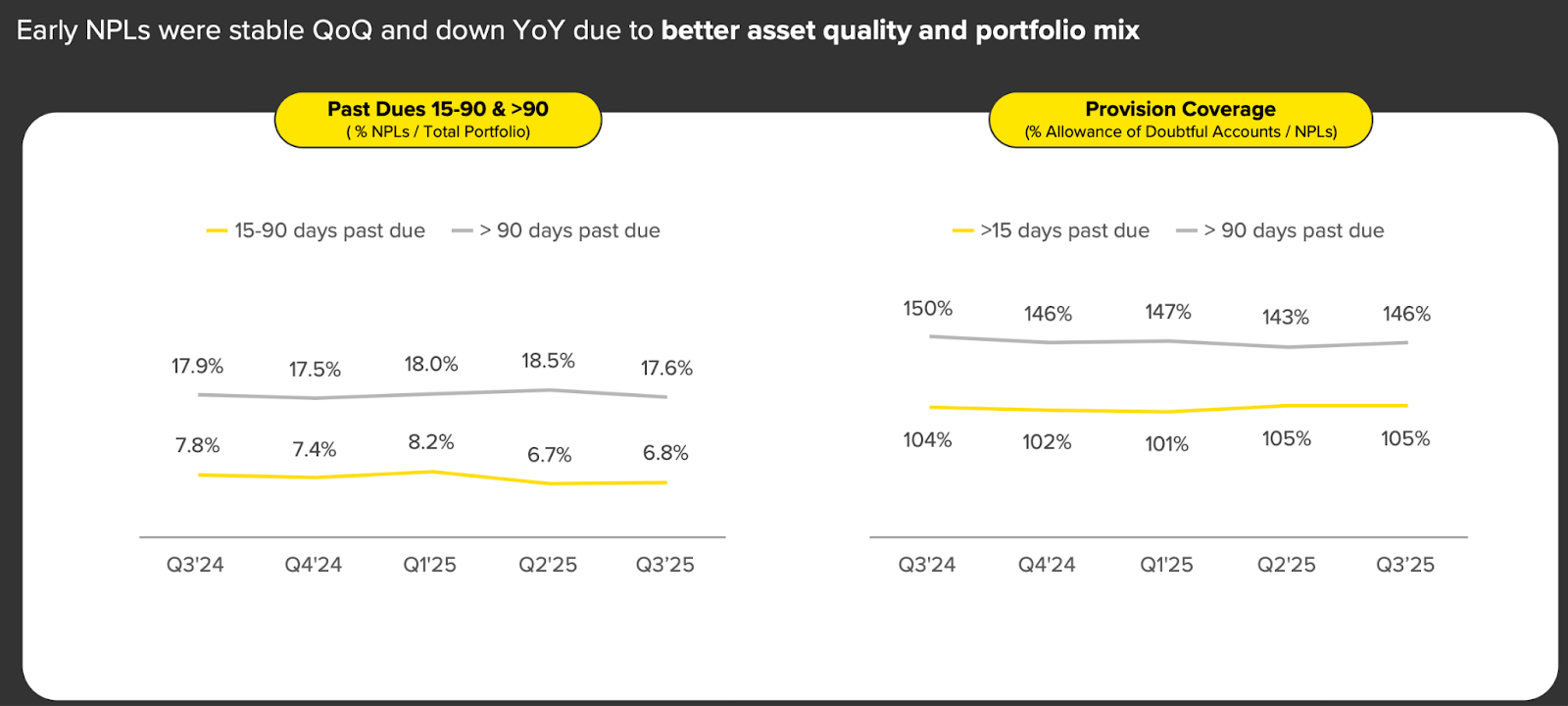 Nubankβs NPLs are noticeably lower than Mercado Pagoβs. That simply means a smaller share of its borrowers end up missing payments. 15-day NPLs sit at 4%, and the 90-day bucket is about 7%. Mercado Pagoβs NPL rate after 15 days is 7%, and after 90 days, it rises to 17.5%.