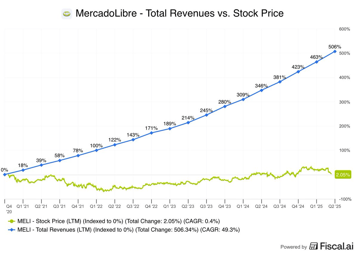 But today, the pendulum has swung in the other direction. Mercado Libre trades at its lowest valuation ever on an EV-to-EBIT basis, at roughly 30x operating earnings. On the surface, that doesnβt sound cheap. But for a company growing revenues around 30%, expanding profits, and still operating in massively underpenetrated markets, itβs at the very least worth a closer look.