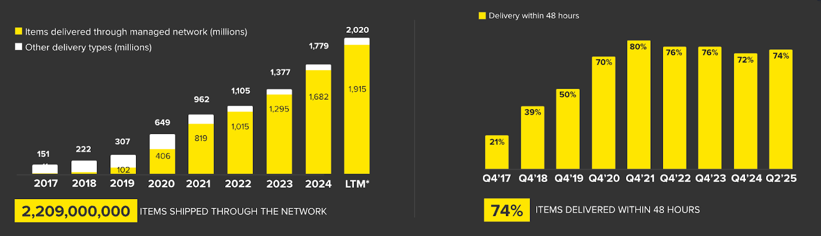 Today, 94% of packages are delivered through Mercado Libreβs own logistics network, and about three-quarters arrive within 48 hours. That is very, very good, even by U.S. or European standards. My Amazon packages never arrive within a day either. Although Iβm a Prime user!