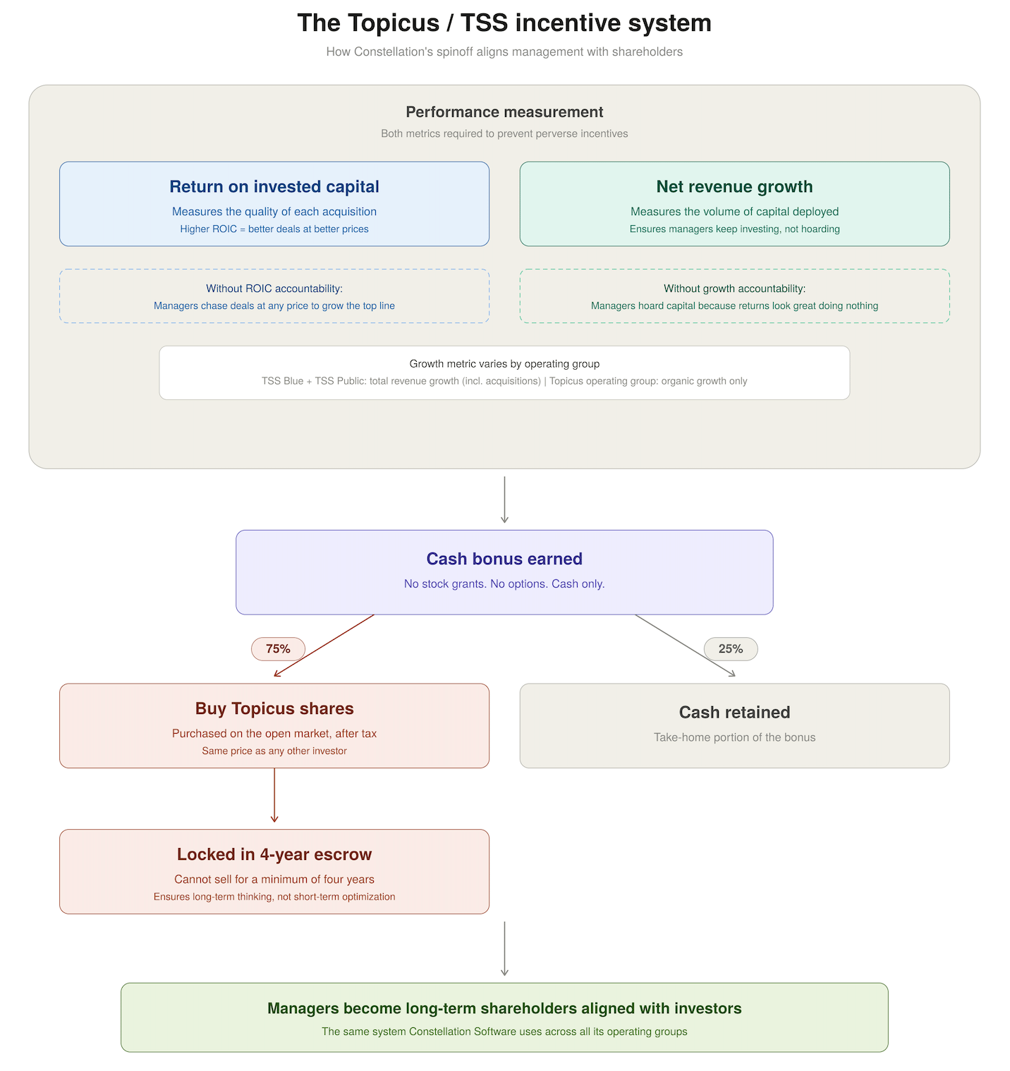 One of the most important things in every programmatic acquirerβs playbook is the incentive system. Topicus/TSS mirrors Constellationβs. The two key drivers for management compensation are Returns on Invested Capital (ROIC) and net revenue growth. You need both because incentivizing only top-line growth degrades acquisition quality, while incentivizing only returns discourages capital deployment.