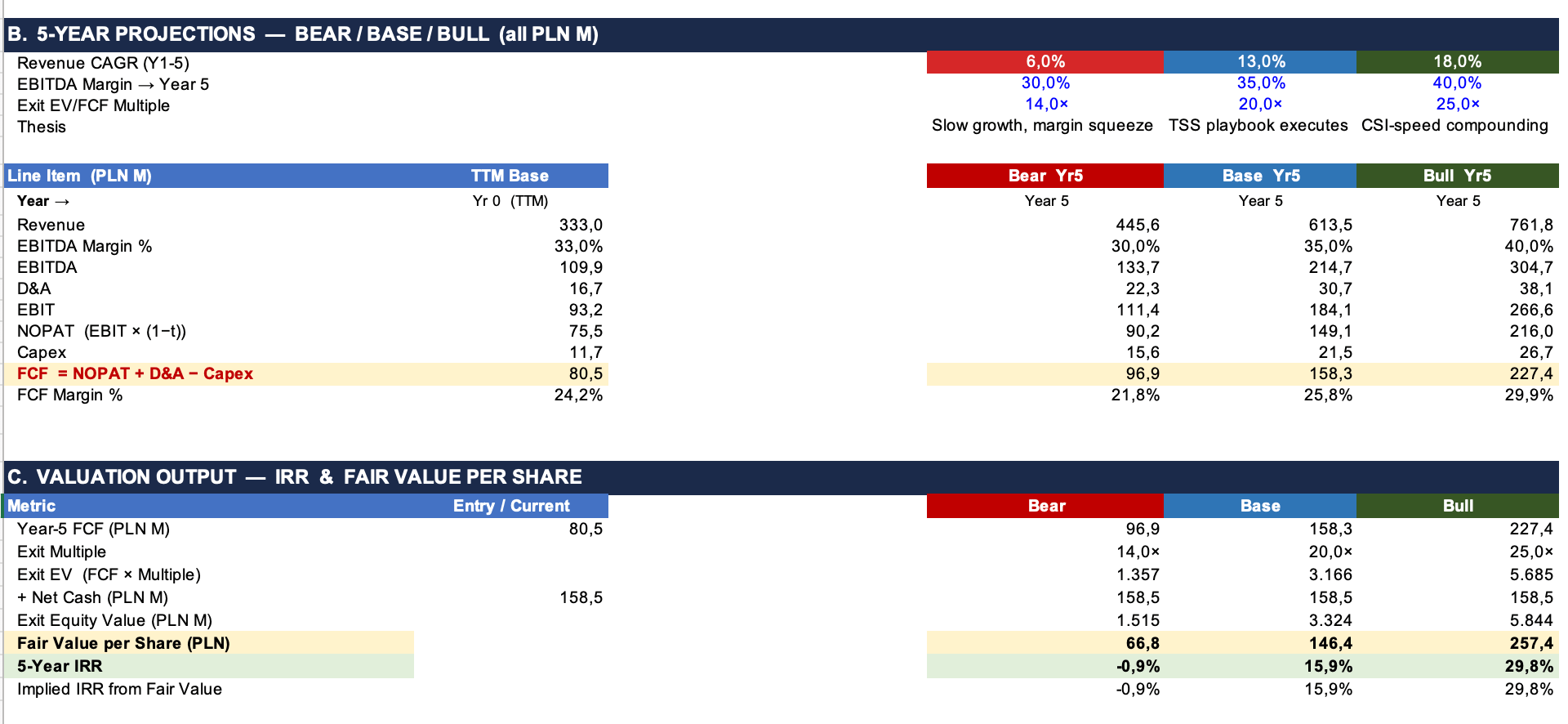 But thereβs another way to think about it. If TSS targets a 20% IRR purely from the earnings yield on their estimate of post-improvement normalized earnings, their purchase price at PLN 85 per share implies they believe the business will earn roughly PLN 17 per share once the operational changes take hold. At todayβs price of about PLN 170, youβre paying about 10x those target earnings.