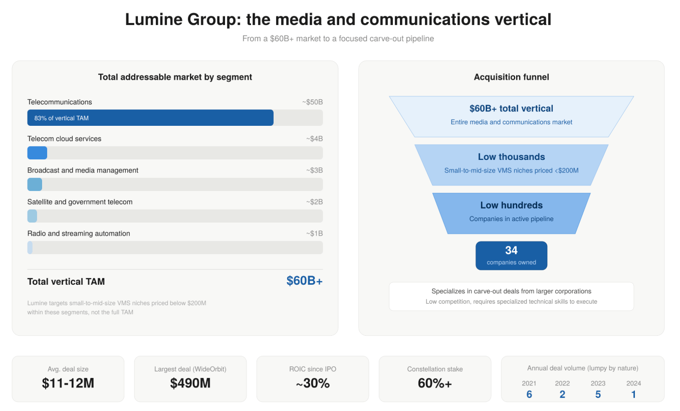 Lumine was spun out of Constellation in 2023 and takes a fundamentally different approach from Topicus. Where Topicus is geographically focused across all of Europe, Lumine is vertically focused on a single sector: media and communications.