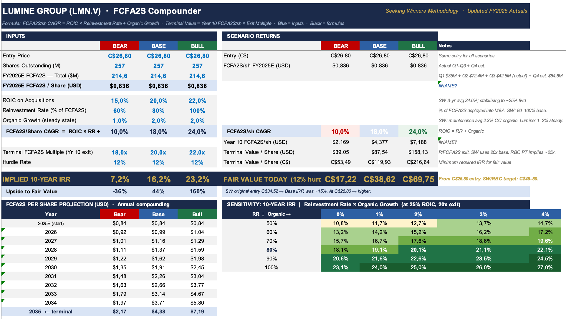 Since Lumine fits right into the Constellation universe with a focus on FCF2S, we use a similar model to Topicus. The assumptions are similar, with the difference of a lower organic growth rate, slightly lower exit multiples due to the lack of a similar track record as Topicus, but higher average reinvestment rates.