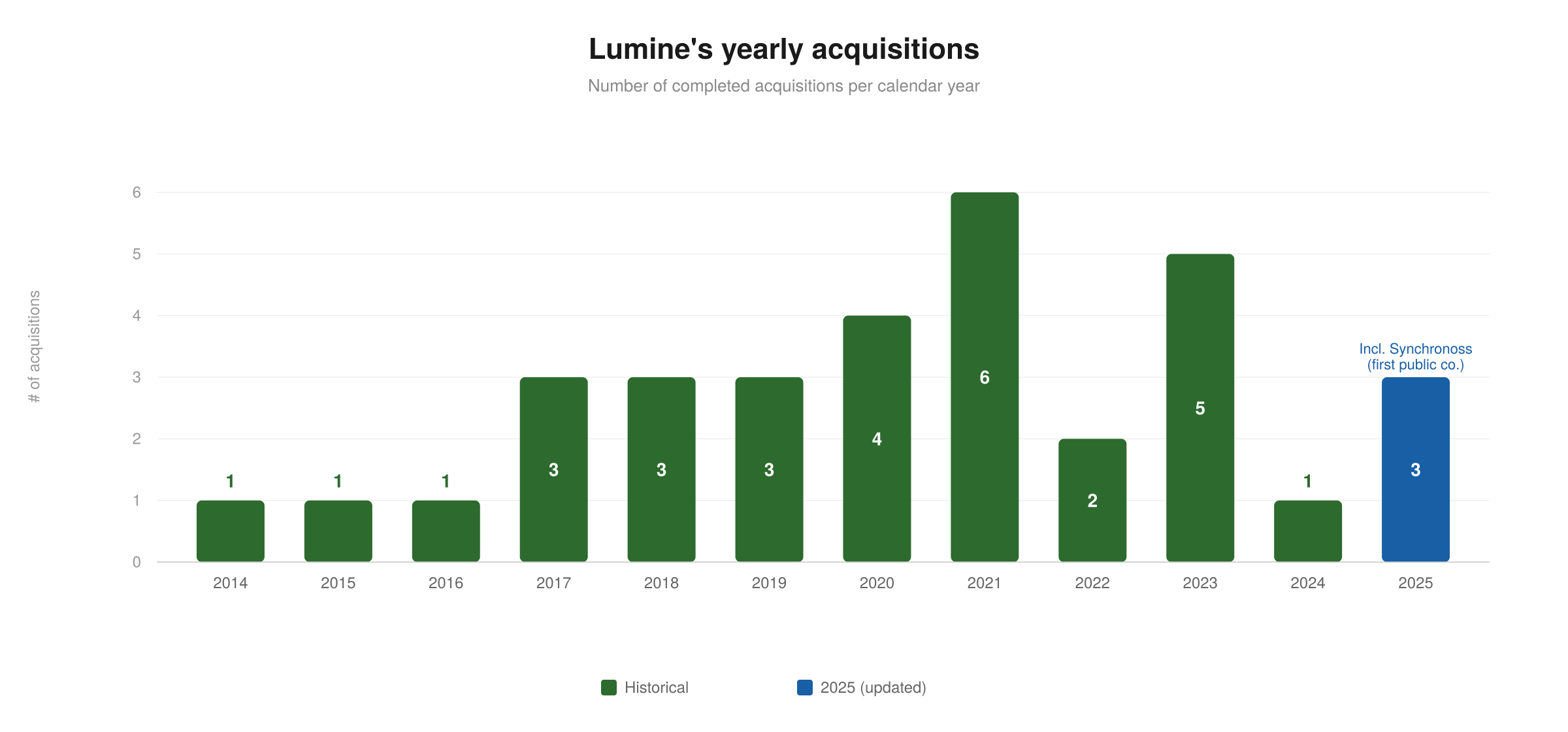 The downside is that carve-outs are harder to source, come at higher ticket sizes (this can also be a disadvantage due to concentration risks), and make deal volume unpredictable. Lumine completed 6 acquisitions in 2021, just 2 in 2022, 5 in 2023, and only a single deal in 2024.