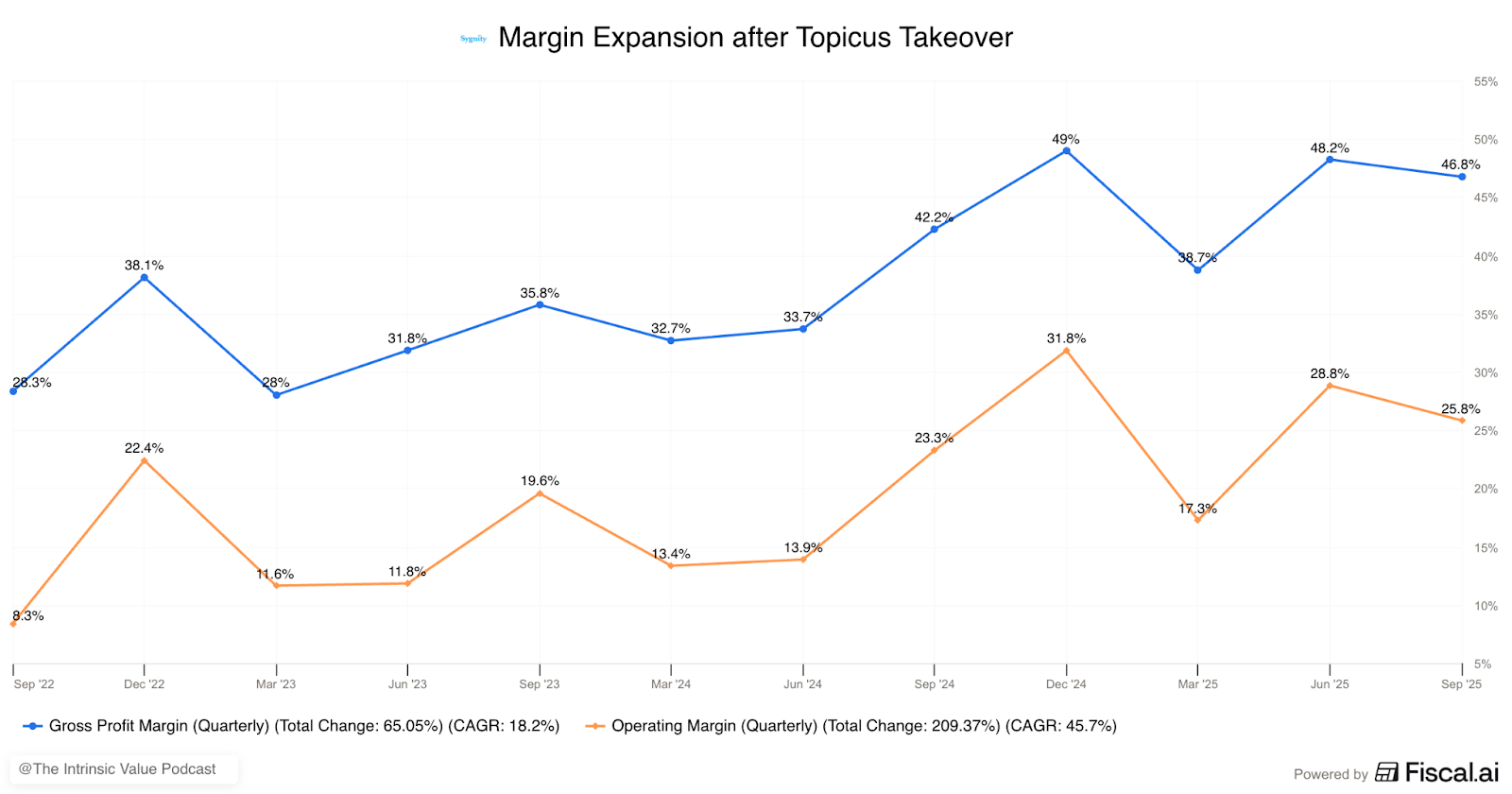 The results of those changes have been pretty strong. In just two and a half years, gross margins expanded from 28% to 47%. Operating margins more than tripled, from 8% to 26%. The stock became a ten-bagger from the point TSS took control β at least before the recent 30% selloff.