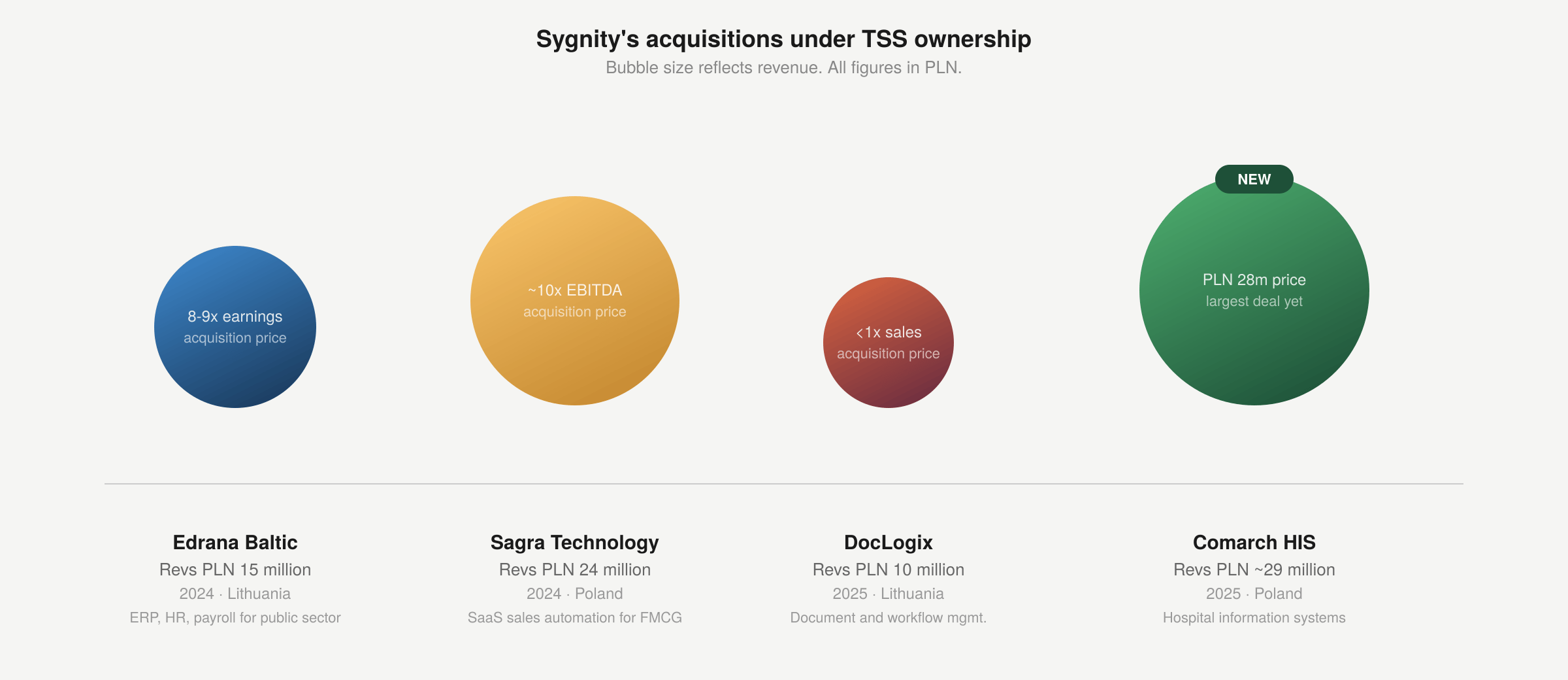 The deals have been attractively priced β Edrana at 8β9x earnings, Sagra at around 10x EBITDA, DocLogix below 1x sales. There arenβt many details about the Comarch deal yet, since it closed just recently.