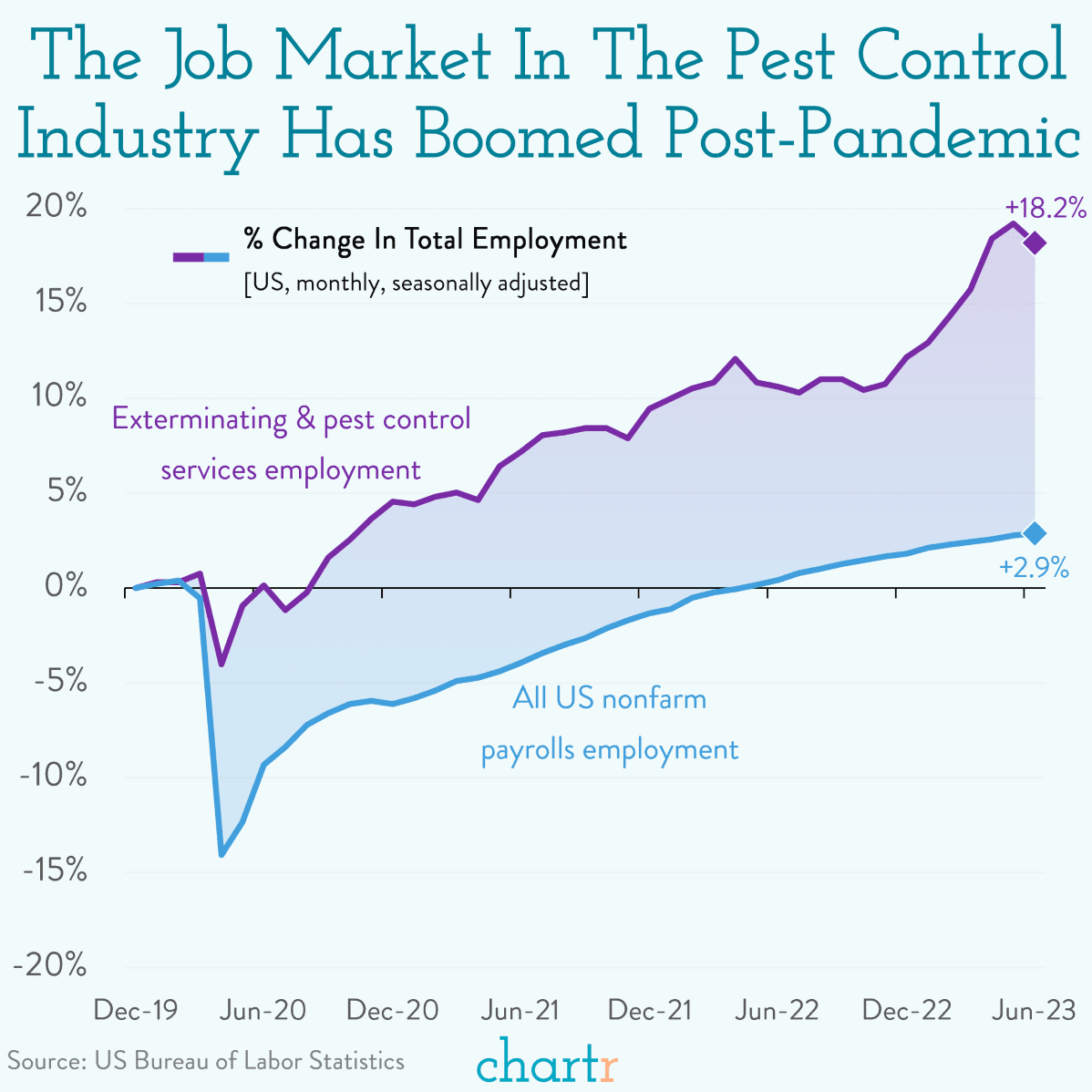 Employment for extermination and pest-control services has risen more than 18% in less than four years, roughly 6x the growth of the economy.