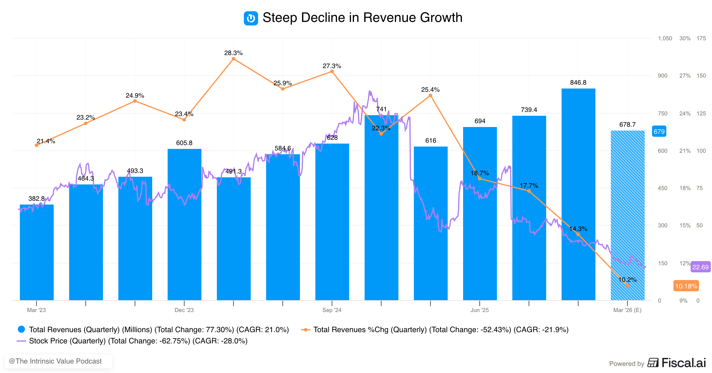 Then it got sequentially worse through 2025. Revenue growth decelerated from 25% in Q1 to around 14% by Q4. The most recent guidance implied only around 10% growth and a year-over-year decline in adjusted EBITDA. Then came a Publicis memo advising clients to avoid Trade Desk over fee-structure concerns, followed by similar moves from WPP and Dentsu regarding the OpenPath platform.